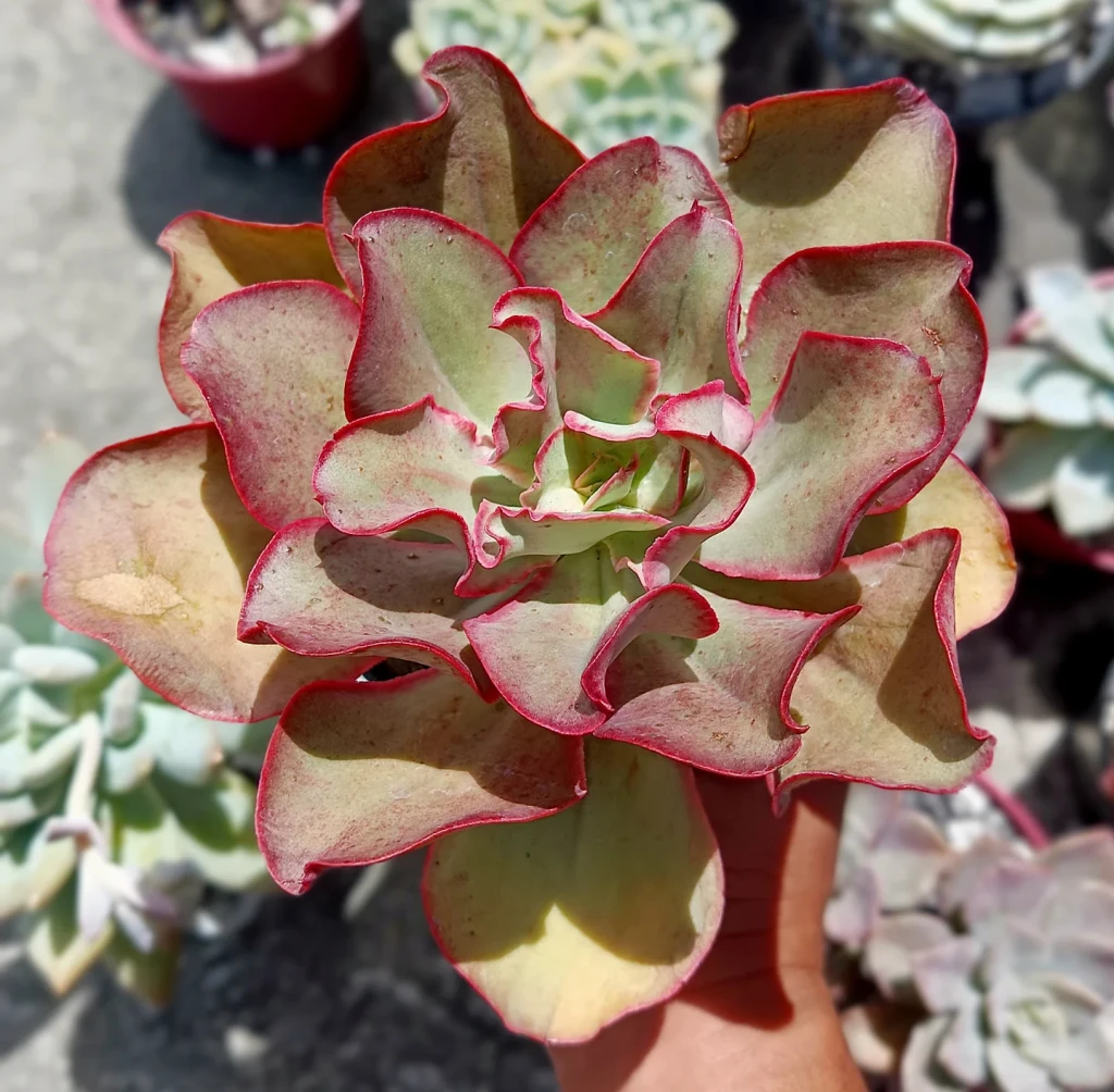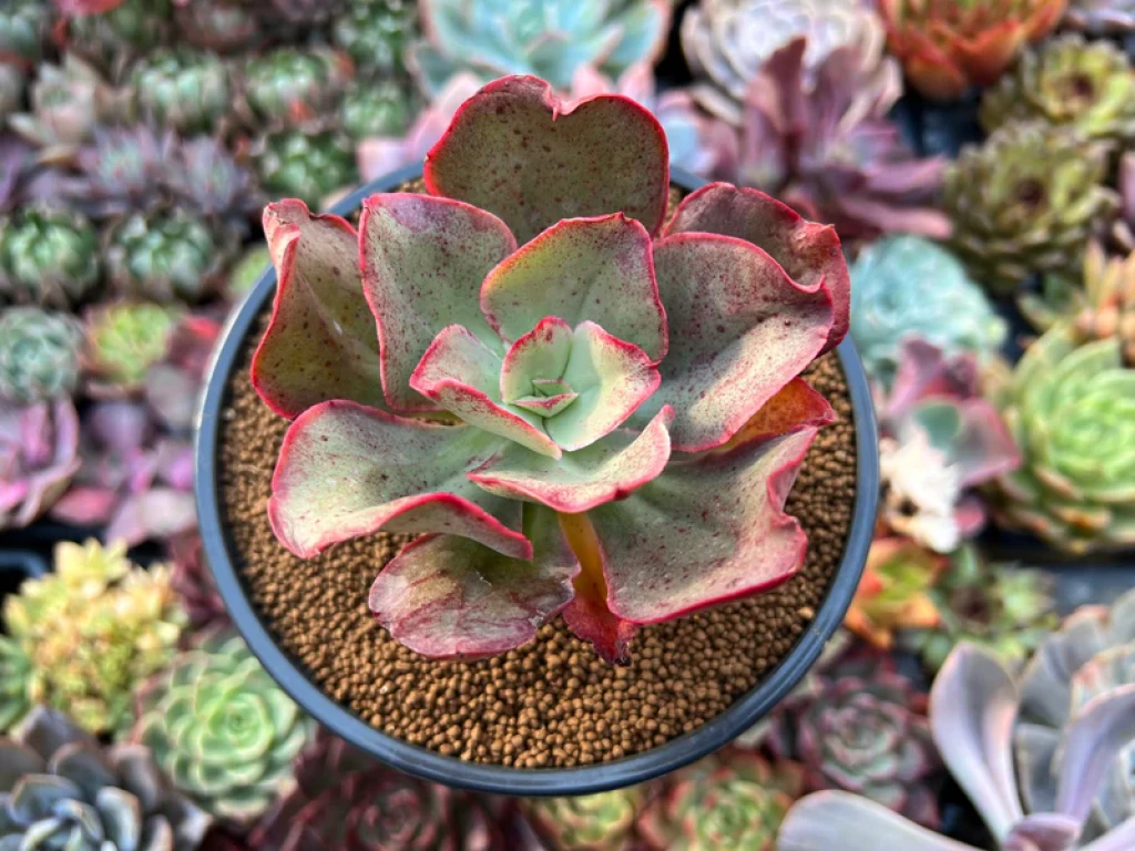 Echeveria ‘Kissing’, Crassulaceae familyasına aittir ve hafif kıvrımlı yapraklarıyla dikkat çeker. Melezlendiği türler bilinmemektedir. Bu kültivar, kompakt yapısı ve simetrik rozet dizilimiyle tanınır. Gövde çoğunlukla kısa ve yapraklar dipten sık yerleşimli şekilde gelişir. Uygun yetiştirme koşullarında rozet formu düzenli ve merkezden dışa doğru katmanlı bir yapı gösterir. Zamanla alt yaprakların kuruması doğal bir süreçtir ve bitkinin gelişimiyle ilişkilidir.