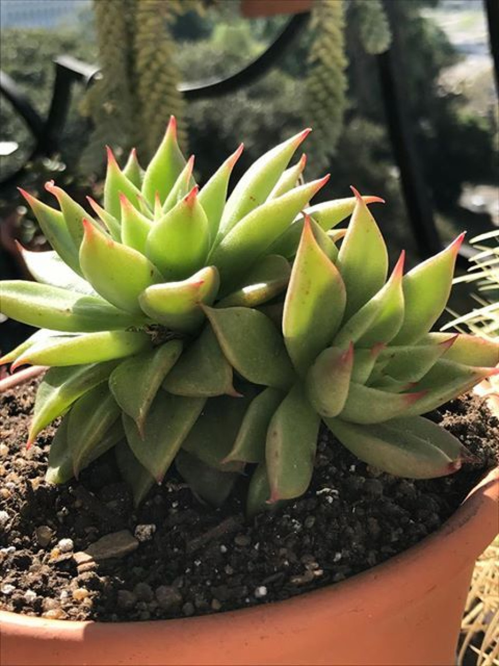 Echeveria ‘Macabeana’, yoğun ve sivri yaprak dizilimiyle dayanıklı bir Echeveria agavoides kültivarıdır. Zamanla dipten çok sayıda yavru vererek sık ve yarı küresel bir koloni oluşturur. Tek rozet genellikle 8–12 cm çapında kalırken, birkaç sezon içinde saksıyı dolduran kompakt bir topluluk hâline gelebilir. Bu özelliği sayesinde hem koleksiyon saksılarında hem de geniş kaplarda dolgun bir görünüm sağlar. Yapraklar dar, üçgenimsi ve belirgin sivri uçludur. Genel renk canlı yeşil tonlarındadır; yeterli ışık altında uç kısımlar ve kenar çizgileri kırmızıya çalan bir pigment kazanır. Bazı bireylerde yaprak yüzeyinde küçük kırmızı beneklenmeler görülebilir. Yaprak dokusu hafif pürüzlü veya ince tüylü bir his verebilir; bu özellik bitkiye mat ve doğal bir görünüm kazandırır. Işık yetersizliğinde rozet gevşer, yaprak araları açılır ve kırmızı uç pigmentasyonu azalır.