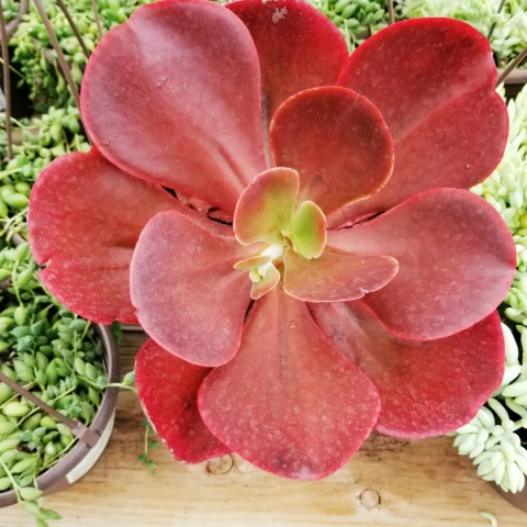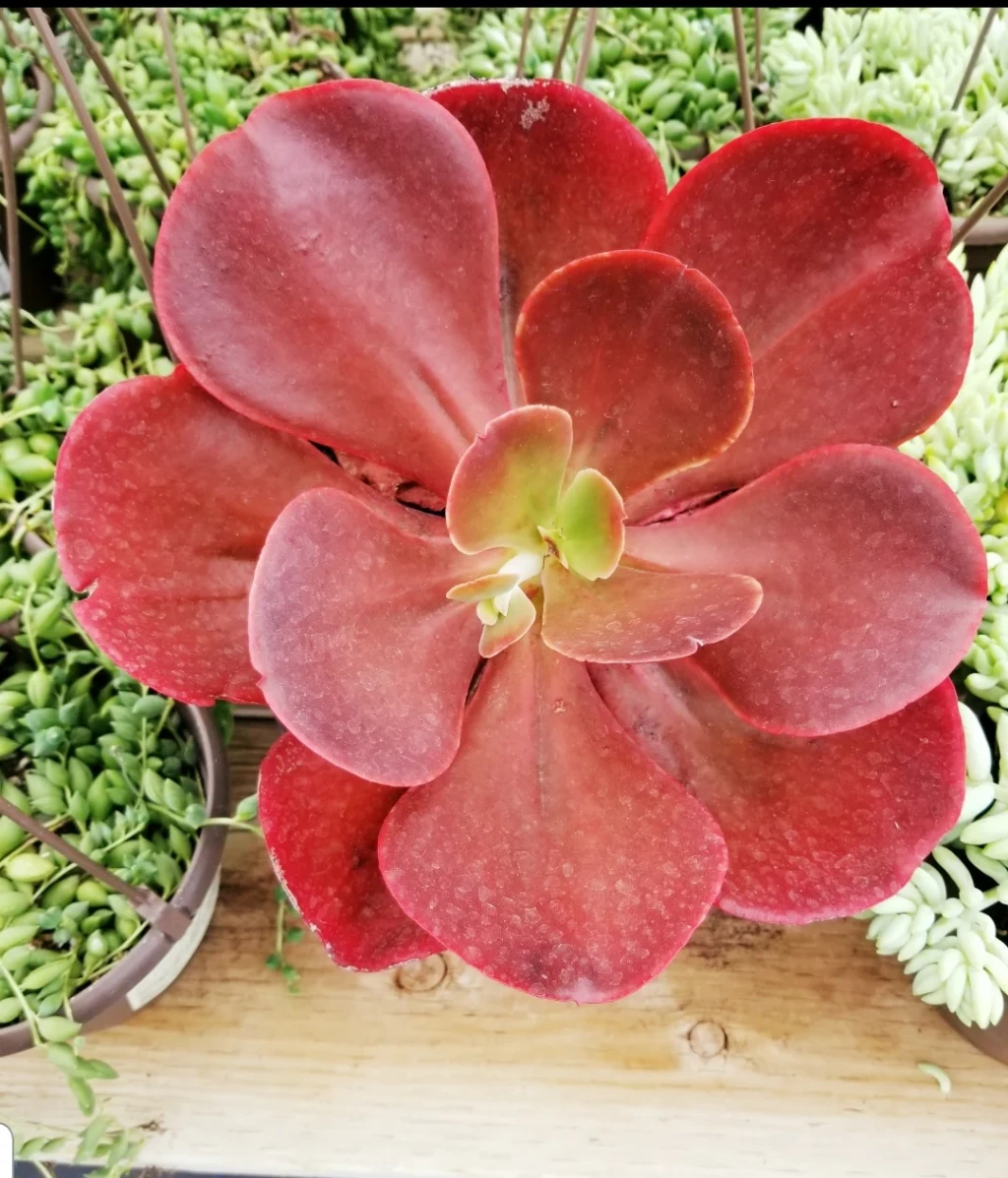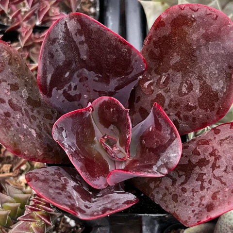 Echeveria ‘Mahogany Rose’, Crassulaceae familyasına ait, koyu tonlu yaprak renkleri ile dikkat çeken bir sukulenttir. Echeveria fimbriata ve bir başka Echeveria türünün melezlenmesi sonucu ortaya çıkmıştır. Kısa gövde üzerinde merkezden dışa doğru katmanlı biçimde dizilen etli yapraklar, simetrik ve kompakt bir rozet oluşturur. Uygun ışık koşullarında rozet yapısı sıkı kalır ve yaprak renkleri belirginleşir. Su depolama kapasitesi yüksek yaprak dokusu, bitkiye kurak dönemlere karşı dayanıklılık sağlar; buna karşılık kök bölgesinde uzun süreli nem birikimi çürüme riskini artırır. Gelişim hızı çevresel koşullara bağlı olarak değişebilir. Echeveria ‘Mahogany Rose’ yaprakları kalın, etli ve genellikle spatula formuna yakındır. Yaprak uçları hafif sivridir ve bazı örneklerde uç kısımlarda pigment yoğunluğu daha belirgindir. Yüzey dokusu pürüzsüzdür ve ince bir mumsu kaplama bulunabilir. Bu kaplama, su kaybını azaltarak yaprakların dayanıklılığını artırır. Yüksek aydınlık altında yaprak yüzeyinde koyu kırmızı, bordo ya da maun tonları gelişebilir. Düşük ışıkta ise renkler daha yeşil-kahverengi tonlara kayabilir ve rozet yapısı gevşeyebilir. Sürekli nemli ortamda yaprak dokusunda yumuşama ve alt yapraklarda çürüme görülebilir.