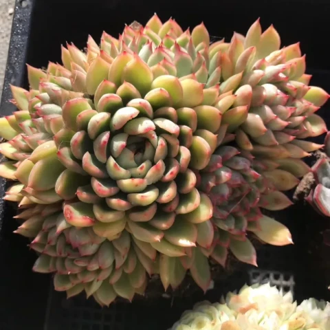 Echeveria ‘Mebina’, yoğun yavrulama eğilimi ve kompakt rozet yapısıyla dikkat çeken bir Echeveria kültivarıdır. Oluşturan Echeveria türleri bilinmemektedir. En belirgin özelliği, kısa sürede çok sayıda yan rozet oluşturarak kümeli bir yapı meydana getirmesidir. Ana rozet zamanla çevresini tamamen yavrularla sarar ve tek bir bitki yerine sık dokulu bir koloni görünümü oluşur. Gövde genellikle kısa kalır; yapraklar gövdeyi tamamen kaplayacak şekilde dizilir. Yapraklar küçük ila orta boyutlu, kalın ve etlidir. Form olarak üçgenimsi-spatula arası bir yapı gösterir. Uç kısımlar hafif sivri ve belirgindir. Renk tabanı açık yeşil ile zeytin tonları arasında değişir. Yeterli ışık aldığında yaprak uçları ve kenarları belirgin pembe-kırmızı tonlara döner. Soğuk ve yüksek ışık koşullarında bu kızarıklık daha yoğun hale gelir. Yaprak yüzeyinde ince bir farina tabakası bulunabilir; bu tabaka bitkiye mat bir görünüm kazandırır ve dokunulduğunda zarar görebilir.