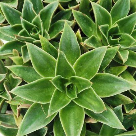 Echeveria ‘Mexicano’, yalın formu ve canlı yeşil tonlarıyla klasik rozet yapısını yansıtır. Bu çeşit, abartılı dalgalanmalardan ya da yoğun farina tabakasından ziyade temiz, parlak ve düzenli bir görünüm sunar. Rozet yapısı simetriktir; yapraklar merkezden dışa doğru spiral dizilim gösterir ve bitki genel olarak dengeli, kompakt bir siluet oluşturur. Uygun koşullarda zamanla dipten yavru vererek kümelenebilir.