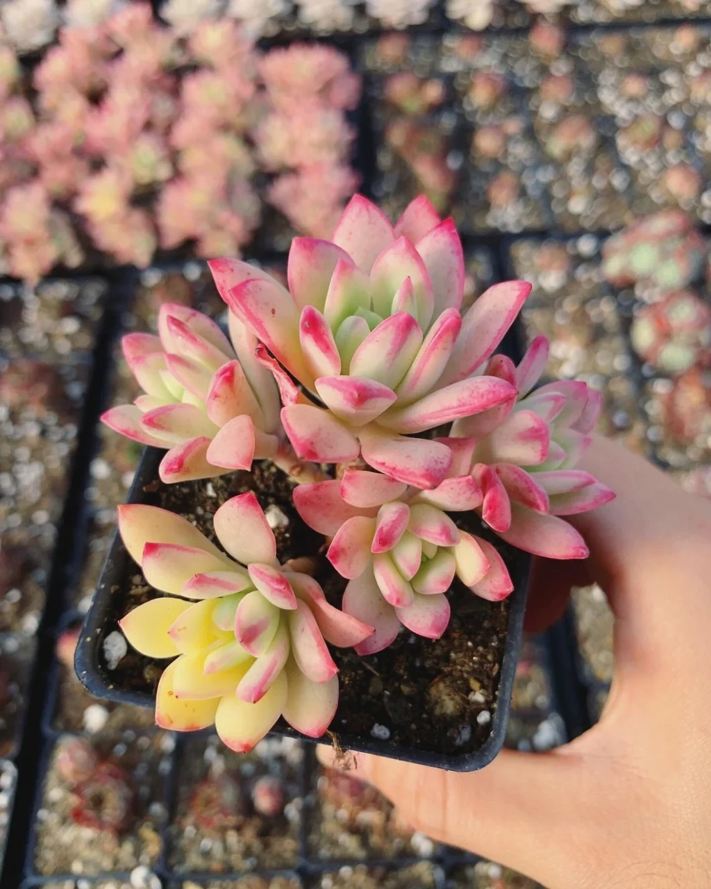 Bu kültivar yüksek aydınlık gerektirir ancak doğrudan yoğun güneşe karşı daha hassas olabilir. Güçlü fakat filtrelenmiş ışık, hem rozet formunun korunmasına hem de variegasyon kontrastının belirginleşmesine yardımcı olur. İç mekânda doğrudan gün ışığı alan fakat yazın filtrelenebilen pencere önü tercih edilmelidir. Ani ve yoğun güneşe maruz kalma açık renkli bölgelerde yanıklara neden olabilir. Dış mekânda sabah güneşi uygun kabul edilir; öğle saatlerindeki sert güneşten korunması gerekir. Yetersiz ışıkta hem pigment yoğunluğu azalır hem de rozet gevşeyebilir. Toprak seçimi hızlı drenaj sağlayacak biçimde yapılmalıdır. Sukulentler için hazırlanmış mineral ağırlıklı karışımlar tercih edilmelidir. Suyu uzun süre tutan ve sıkışan topraklar kök çürümesine zemin hazırlar. Saksıda drenaj deliği bulunması önemlidir. Toprak saksı kullanımı, karışımın daha hızlı kurumasına yardımcı olur. Saksı çapı kök hacmini aşmamalıdır; geniş saksılar alt katmanlarda nem birikimine neden olabilir. Küçük ve yavaş gelişen yapısı nedeniyle aşırı büyük saksı tercih edilmemelidir.