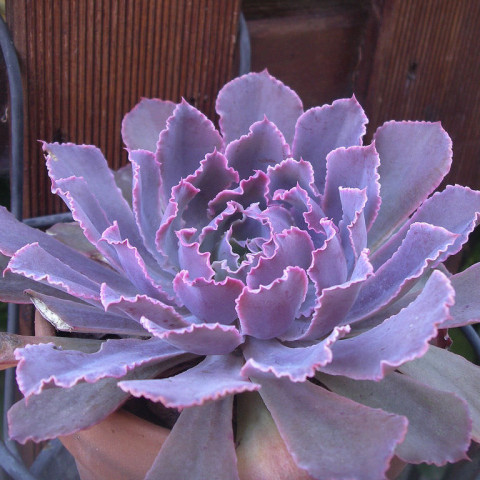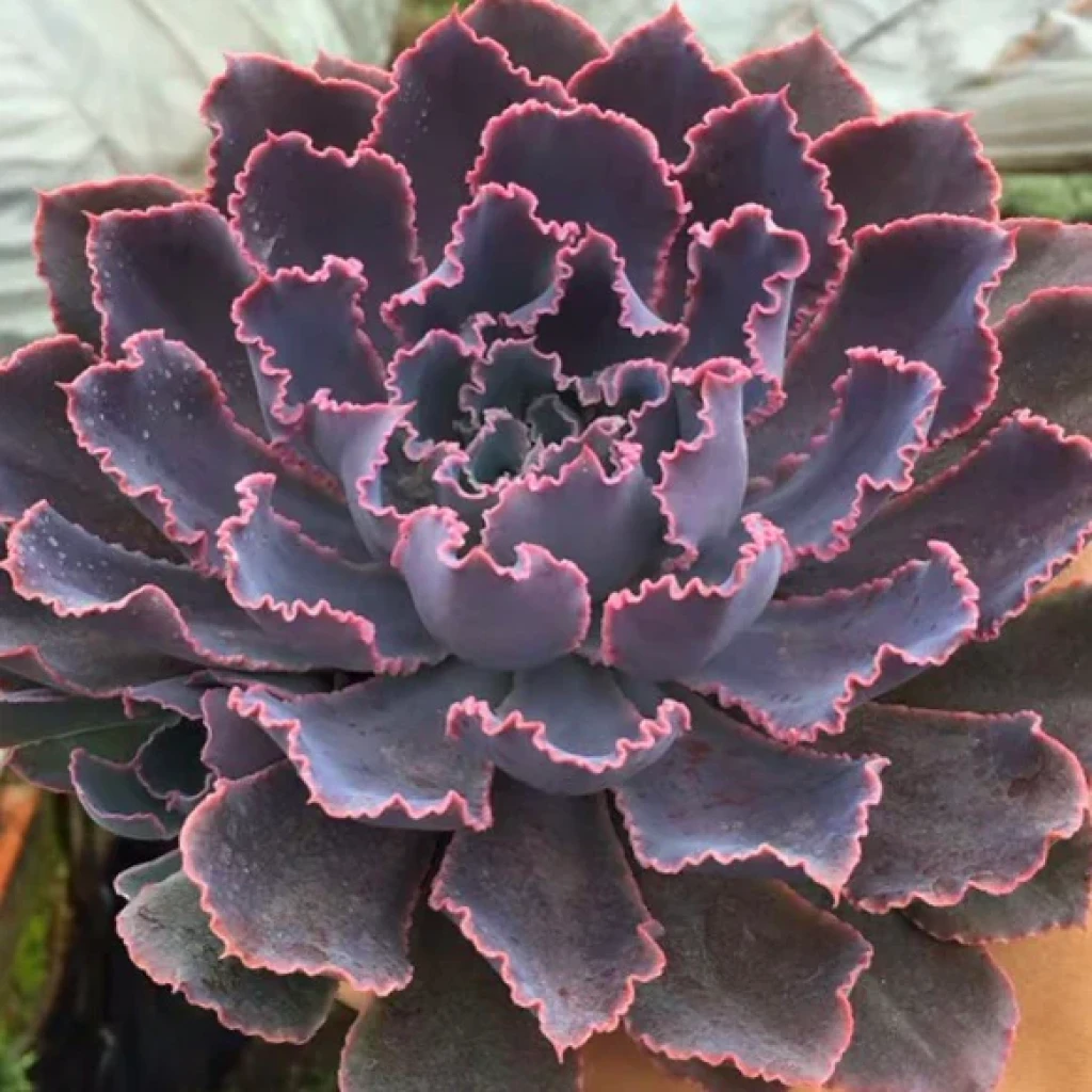Echeveria ‘Neon Breakers’, dalgalı ve kıvrımlı yaprak kenarlarıyla ayırt edilen, gösterişli ve koleksiyon değeri yüksek bir kültivardır. Melezlendiği Echeveria türleri bilinmemektedir. Geniş çaplı, katmanlı ve oldukça yoğun bir rozet formu oluşturur. Olgun bireylerde rozet yapısı merkezden dışa doğru belirgin bir spiral düzen sergiler. Yapraklar üst üste binen katmanlar halinde dizildiği için bitki hacimli ve dolgun bir görünüm kazanır. Zamanla dipten yeni sürgünler oluşturarak kümelenebilir, ancak genellikle tek ve güçlü bir ana rozet ön plandadır. Bu kültivarın en dikkat çekici özelliği yaprak kenarlarındaki kıvrımlı ve fırfırlı yapıdır. Yapraklar kalın, geniş ve etlidir. Kenarlar belirgin biçimde dalgalıdır ve güçlü ışık altında neon pembe ya da fuşya tonlarında bir çerçeve oluşturur. Yaprak yüzeyinde ince bir farina tabakası bulunur; bu mat kaplama gri–lila, mor ve açık mavi tonlarını yumuşatır. Serin geceler ve yüksek ışık, pembe kenar hattının daha canlı ve kontrastlı görünmesini sağlar. Işık yetersiz olduğunda hem dalgalı yapı daha gevşek görünür hem de renkler daha soluk hale gelir.