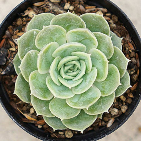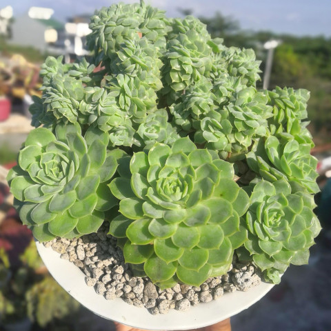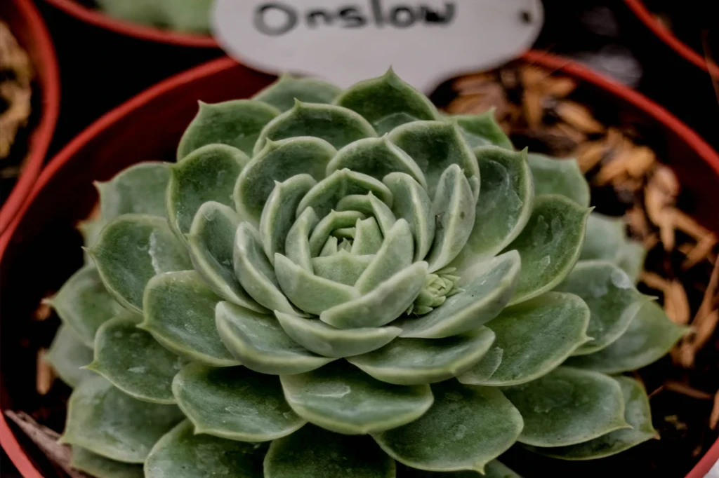 Echeveria 'Onslow', Crassulaceae familyasına ait, simetrik ve yoğun yaprak dizilimiyle dikkat çeken hibrit bir Echeveria kültivarıdır. Echeveria 'Lola' ve Echeveria elegans'ın çaprazlanması sonucu elde edilen bir melezdir. Bitki, kompakt rozet formu ve dengeli büyüme karakteriyle koleksiyon sukulentleri arasında yer alır. Gövde kısa ve çoğunlukla yaprakların altında gizlidir. Uygun koşullarda dipten yavru oluşturarak zamanla kümelenebilir. Formunu uzun süre koruyabilmesi, bu kültivarın tercih edilme nedenlerinden biridir. Echeveria 'Onslow' yaprak özellikleri, düzenli spiral dizilim ve belirgin uç yapısıyla tanımlanır. Yapraklar kalın, etli ve su depolama kapasitesi yüksek yapıdadır. Form olarak geniş üçgensi ve hafif kaşık formuna yakın olabilir. Uç kısmı sivri ve çoğunlukla pembe tonlu küçük bir nokta ile sonlanır. Yaprak yüzeyi mat ve ince farina tabakasıyla kaplıdır. Bu pudramsı yapı bitkiye açık yeşil ile mavi-yeşil arası bir ton kazandırır. Işık yoğunluğu arttıkça kenar ve uç pigmentasyonu daha belirgin hale gelebilir. Yetersiz ışıkta yapraklar daha düz yeşil tona dönebilir.