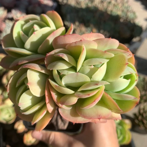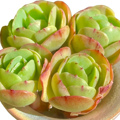 Echeveria ‘Peach Pride’, geniş yapraklı rozet formu ve kenarlarda belirginleşen sıcak tonlarıyla öne çıkan bir Echeveria kültivarıdır. Bitki genellikle orta büyüklükte tek bir ana rozet olarak gelişir; uygun koşullarda dipten yavrular oluşturarak zamanla kümeli bir yapı meydana getirebilir. Yapraklar geniş, yuvarlak formunda ve kalındır. Uç kısımları yuvarlak ile hafif sivri arasında değişkenlik gösterebilir. Ana renk açık yeşil ile sarımsı yeşil arasında seyreder. Yüksek ışık ve serin hava koşullarında yaprak kenarlarında turuncuya çalan pembe-kırmızı tonlar belirginleşir. Bu kenar renkliliği, bitkinin ayırt edici özelliklerinden biridir. Yaprak yüzeyinde ince bir farina tabakası bulunur; bu tabaka yaprağa mat ve hafif pudramsı bir görünüm kazandırır.
