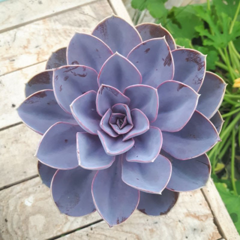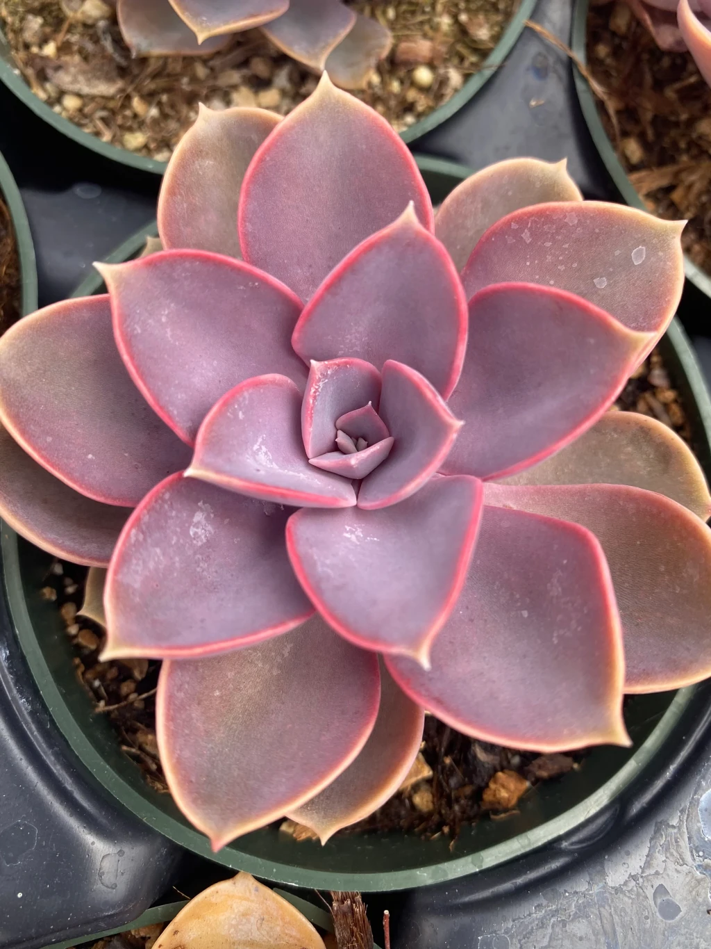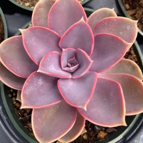 Echeveria ‘Purple Pearl’, adından da anlaşılacağı üzere mor ve lila tonlarının hâkim olduğu, zarif ve dengeli rozet formuyla öne çıkan bir türdür. Doku kültürü yoluyla Echeveria 'Perle von Nürnberg'in çoğaltılması sonucu elde edilmiştir.Orta boyutlu rozetler oluşturur ve yapraklar merkezden dışa doğru düzenli, simetrik bir spiral şeklinde dizilir. Sağlıklı gelişen bireylerde rozet kompakt ve sıkı kalır; ışık koşulları uygun olduğunda yaprak araları açılmaz ve bitki formunu uzun süre korur. Zamanla dipten yeni bitkiler oluşturarak kümelenebilir. Yapraklar kalın, etli ve hafif sivri uçludur. Yüzeyde ince bir farina tabakası bulunur; bu pudramsı kaplama bitkiye mat, kadifemsi bir görünüm kazandırır ve tonları yumuşatır. Temel renk genellikle açık mor, lavanta ve gri–lila arasında değişir. Güçlü ışık altında yaprak kenarlarında daha belirgin pembe ya da fuşya tonlu bir çerçeve oluşur. Serin gecelerle birlikte mor tonlar derinleşir ve merkez kısmı daha yoğun renk alabilir. Işık yetersiz olduğunda renkler daha soluk gri–yeşil tonlara kayabilir ve rozet yapısı gevşeyebilir.