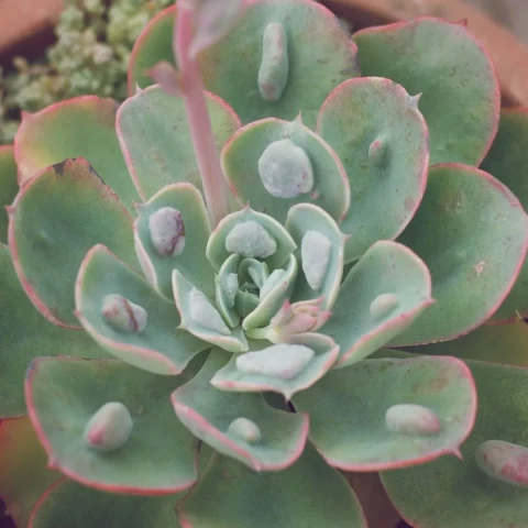 Echeveria ‘Rain Drops’, yaprak yüzeyindeki belirgin kabarcık formasyonları ile tanınan, görsel açıdan ayırt edici bir Echeveria kültivarıdır. Kompakt ve düzenli bir rozet oluşturur. Gövde kısa kalır ve yapraklar sık spiral dizilimle gövdeyi tamamen kaplar. Bitki yaşlandıkça alt yapraklar kuruyarak uzaklaşır ve kısa bir gövde görünür hale gelebilir. Sağlıklı bireyler genellikle tek merkezli büyür; nadiren dipten yan sürgün oluşturabilir. Bu kültivarın en belirgin özelliği, yaprakların üst yüzeyinde oluşan yuvarlak, su damlasını andıran kabartılardır. Bu kabarcık yapılar genetik bir özelliktir ve yaprak epidermisinin belirli bölgelerde kalınlaşmasıyla ortaya çıkar. Yapraklar kalın, etli ve geniş spatula formundadır. Uç kısımları hafif sivridir. Renk temel olarak açık yeşil ile gri-yeşil arasındadır; yeterli ışık altında yaprak kenarlarında pembe ve kırmızı tonlar belirginleşir. Kabarcık bölgelerde çoğu zaman daha açık renkli veya hafif beyazımsı bir görünüm oluşur. Yaprak yüzeyi ince bir farina (mumsu) tabakası ile kaplıdır; bu tabaka mat görünüm sağlar ve temasla zarar görebilir.