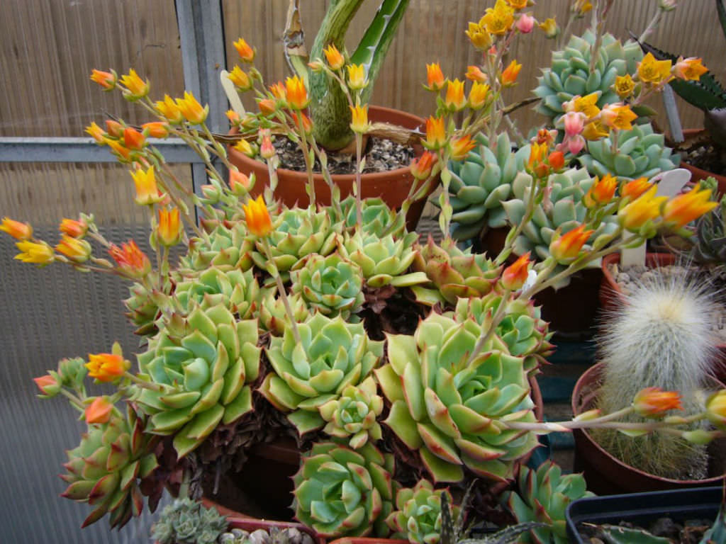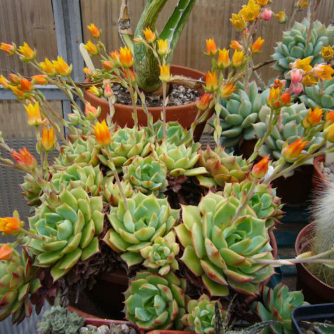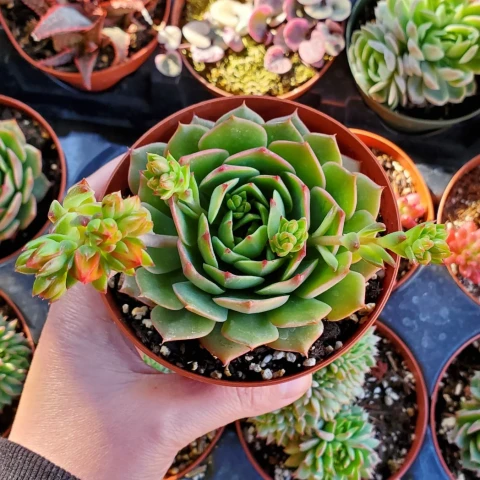 Saksı drenaj delikli olmalıdır. Toprak saksı tercih edilmesi, fazla nemin daha hızlı uzaklaşmasına yardımcı olur. Saksı hacmi kök kütlesiyle uyumlu seçilmelidir. Aşırı büyük saksılar karışımın geç kurumasına neden olarak çürüme riskini artırabilir. Saksı değişimi genellikle ilkbaharda yapılır ve bu süreçte kökler kontrol edilir. Çoğaltma işlemi çoğunlukla yavru rozetlerin ayrılmasıyla yapılır. Yan sürgünler ana bitkiden dikkatlice ayrılır ve kesik yüzey birkaç gün kurutulduktan sonra geçirgen karışıma dikilir. Yaprak çeliği yöntemi de uygulanabilir; ancak rozet ayırma daha hızlı sonuç verir. Kümeli form korunmak isteniyorsa saksı içinde birlikte büyümelerine izin verilebilir.