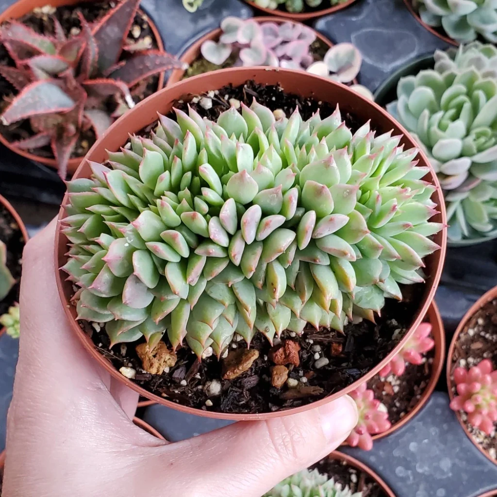 Yapraklar kısa, etli ve üçgenimsi yapıdadır. Ana renk açık yeşil ile mavi-yeşil tonları arasında değişir. Uygun ışık altında yaprak uçlarında hafif kırmızımsı tonlar görülebilir. Crest formda yapraklar daha sık dizildiği için yüzey daha kompakt ve yoğun görünür. Yaprak yüzeyi genellikle mat olup hafif pudramsı bir doku gösterebilir. Sürekli nemli ortamda alt yapraklarda yumuşama ve çürüme riski artar. Crest formda yapraklar birbirine daha yakın olduğu için hava sirkülasyonu özellikle önemlidir.