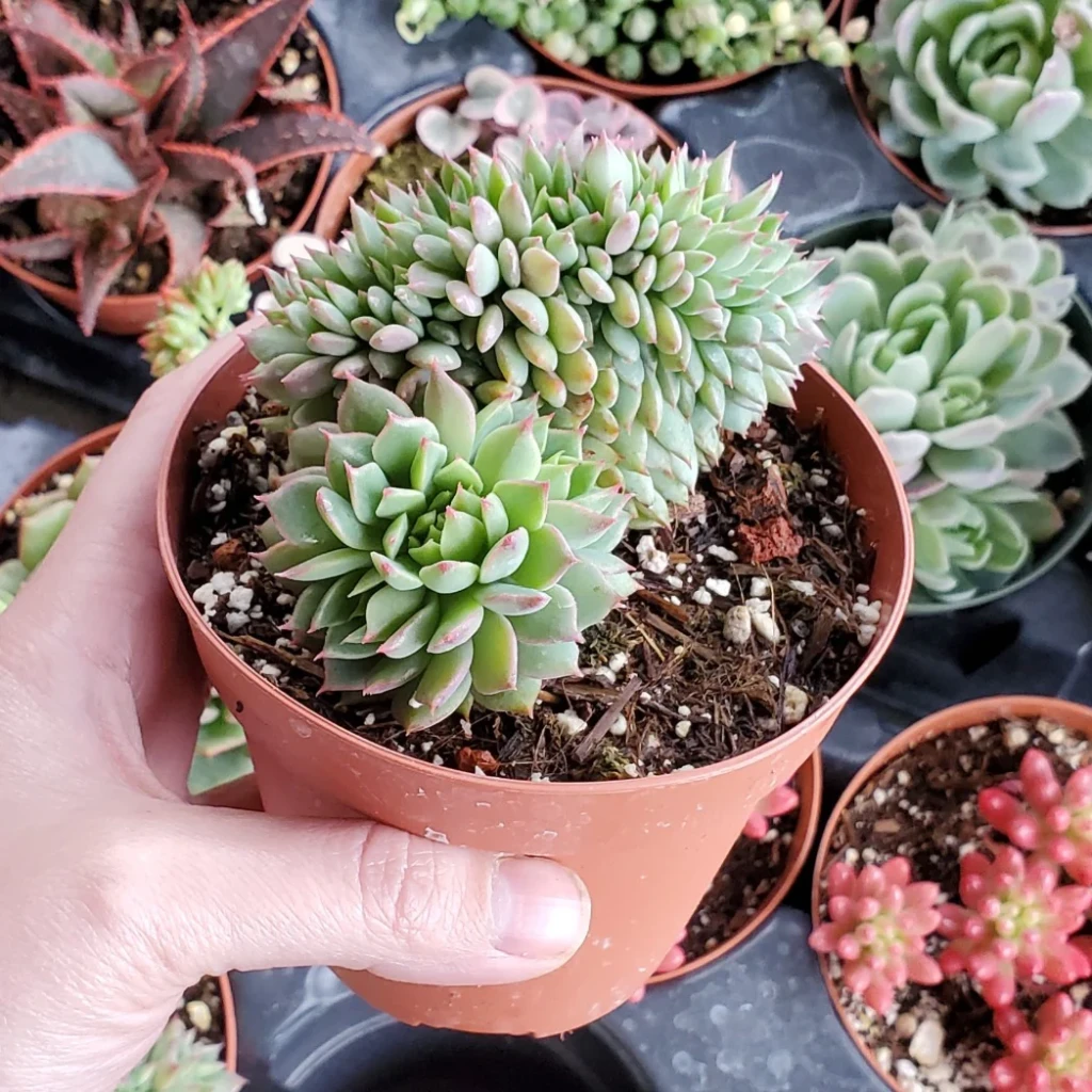 Saksı drenaj delikli olmalıdır. Toprak saksı tercih edilmesi, fazla nemin daha hızlı uzaklaşmasına yardımcı olur. Saksı hacmi kök kitlesiyle orantılı seçilmelidir. Gereğinden büyük saksılar toprağın geç kurumasına neden olarak kök çürümesi riskini artırabilir. Saksı değişimi genellikle ilkbaharda yapılır ve kökler kontrol edilerek sağlıksız kısımlar temizlenir. Çoğaltma işlemi crest formda daha dikkatli yapılmalıdır. Yaprak çeliği yöntemi çoğu zaman normal rozet formuna dönüşle sonuçlanabilir. Crest özelliğini korumak için fasiyasyonlu sürgünün gövde çeliği olarak alınması gerekir. Kesik yüzey birkaç gün kurutulduktan sonra geçirgen karışıma yerleştirilir. Köklendirme sürecinde sulama minimum düzeyde tutulmalıdır. Gübreleme yalnızca ilkbaharda ve düşük dozda uygulanmalıdır. Sukulentler için dengeli içerikli besinler tercih edilir. Yüksek azotlu uygulamalar dokunun gevşemesine ve crest formun deformasyonuna yol açabilir.