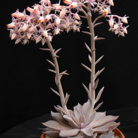 Çiçeklenme genellikle ilkbahar sonu ile yaz başında görülür. İnce çiçek sapları üzerinde turuncu-pembe tonlarda çan formunda çiçekler açar. Çiçekler rozetin üzerine yükselerek görsel kontrast oluşturur. Çoğaltma yaprak çeliği veya yan sürgün ayırma ile yapılabilir. Yaprak dipten ayrılmalı ve kesik yüzey kurutulduktan sonra dikilmelidir. Farina tabakasına zarar vermemek için yapraklara temas minimumda tutulmalıdır. Gübreleme yalnızca ilkbaharda ve düşük dozda yapılmalıdır. Sukulentlere uygun dengeli formüller tercih edilmelidir. Aşırı azotlu gübreler yaprak dokusunu yumuşatabilir ve pastel tonların kaybolmasına neden olabilir.