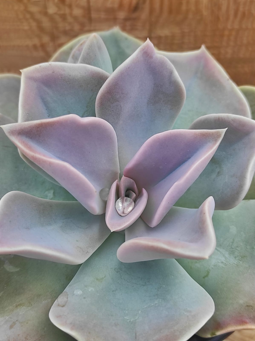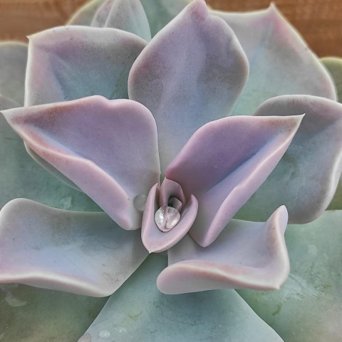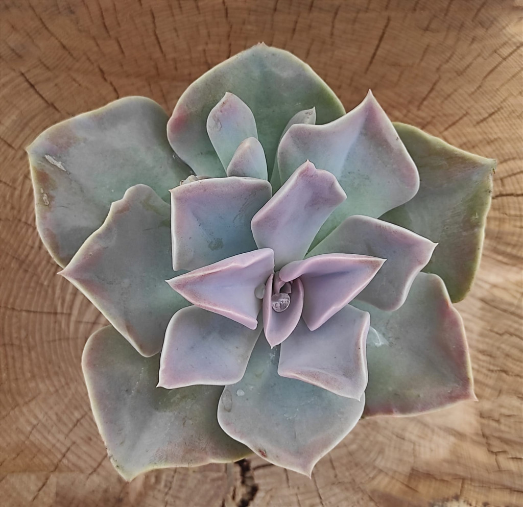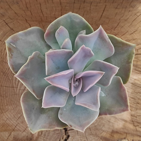 Echeveria ‘Rodolfoii’, pudramsı mor-gri tonları ve geniş üçgensi yaprak formuyla dikkat çeken zarif bir hibrittir. Renk geçişleri ışığa bağlı olarak değişir; açık lila, gri-mor ve tozlu pembe tonları arasında dolaşabilir. Rozet orta boydur ve yapraklar geniş tabanlı, uca doğru sivrilen üçgensi formdadır. Yaprak yüzeyinde belirgin bir farina (mumsu pudra tabakası) bulunur. Bu doğal tabaka hem dekoratif bir matlık verir hem de bitkinin su kaybını azaltmasına yardımcı olur. Yaprak kenarlarında çok ince pembe-kırmızı bir hat görülebilir. Güçlü ışık altında bu kenar hattı belirginleşir ve merkez kısmı daha kompakt kalır.