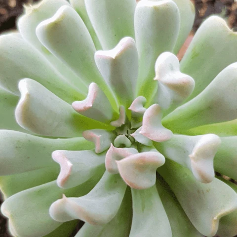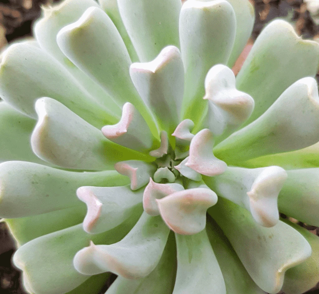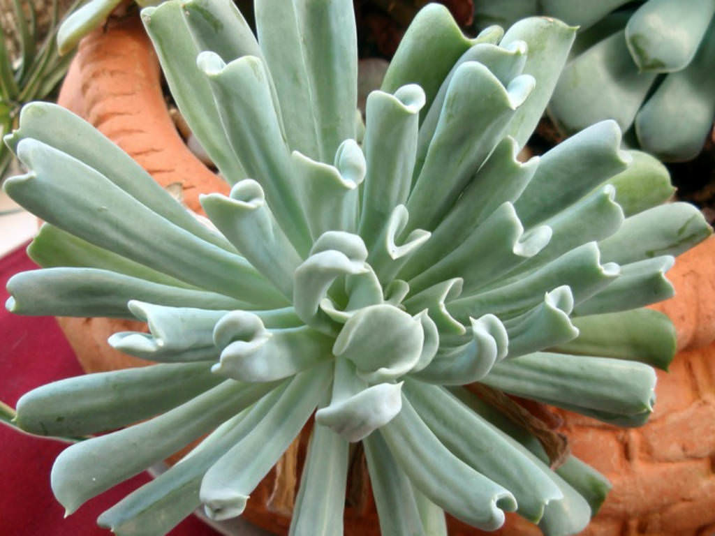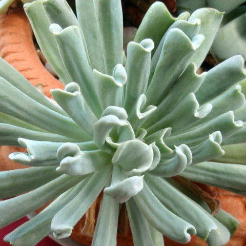 Echeveria runyonii ‘Topsy Turvy’, sukulent dünyasında formuyla ilk bakışta fark edilen kültivarlardan biridir. Echeveria runyonii türünün bir varyetesidir. En ayırt edici özelliği, yapraklarının uçtan içe doğru kıvrılmasıdır. Mavi-yeşil ile soluk gri arasında değişen tonları, yüzeydeki farina tabakası sayesinde mat ve pudramsı bir etki oluşturur. Işık koşullarına bağlı olarak renk yoğunluğu değişebilir; güçlü ve dengeli ışıkta daha kompakt ve belirgin kıvrımlı bir rozet formu gelişir. Rozet yapısı genellikle 10–15 cm çapına ulaşır ve zamanla yan sürgünler vererek kümelenme eğilimi gösterir. Yapraklar kalın, etli ve geniştir; uçlara doğru yukarı kıvrılarak ters kaşık benzeri bir form alır. Bu karakteristik yapı, özellikle yukarıdan bakıldığında heykelsi bir kompozisyon oluşturur. İç mekânda yetiştirilecekse aydınlık bir pencere önü tercih edilmelidir. Sabah güneşi bitkinin kompakt kalmasını destekler. Yetersiz ışıkta rozet gevşer, yapraklar düzleşir ve kıvrım özelliği zayıflar.
