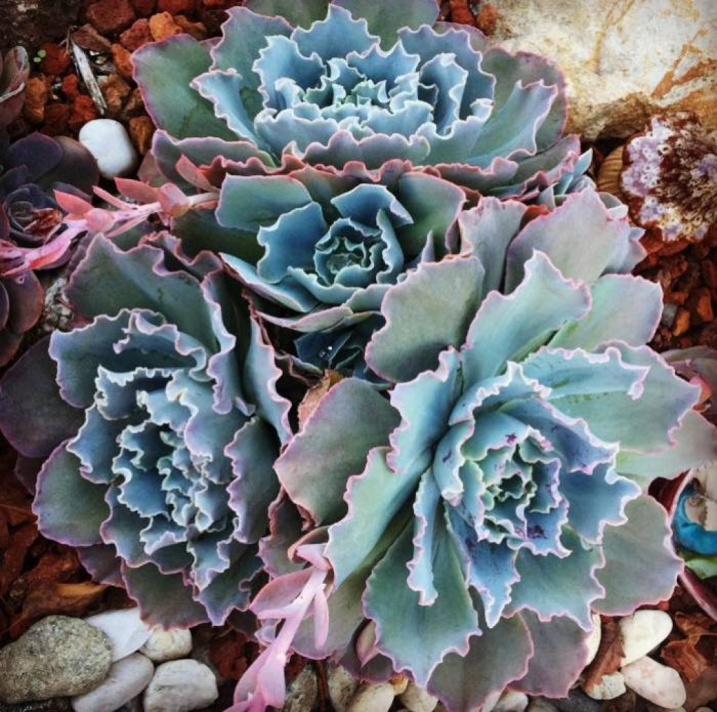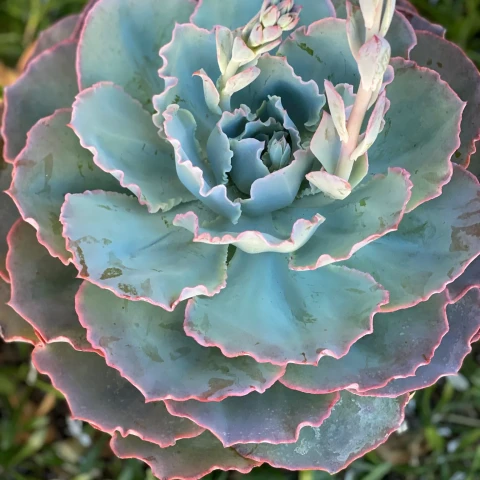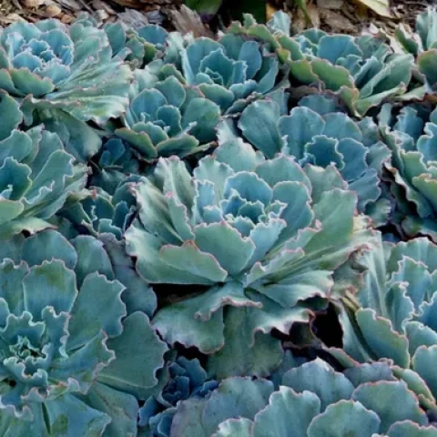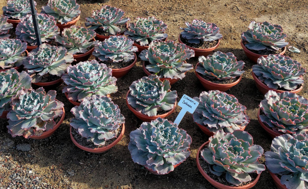 Echeveria ‘Sahara’, geniş rozet formu ve belirgin dalgalı yaprak kenarlarıyla öne çıkan hibrit bir Echeveria kültivarıdır. Katmanlı ve simetrik gelişim gösteren bu tür, olgunlaştıkça çapı genişleyen, merkezden dışa doğru düzenli şekilde açılan bir yapı oluşturur. Genç dönemde gövde görünmezken, alt yaprakların zamanla kuruyup dökülmesiyle kısa ve kalın bir gövde oluşabilir. Yapraklar kalın, geniş ve etlidir; su depolama kapasitesi yüksektir. Ana renk genellikle mavi-yeşil veya grimsi mint tonlarındadır. Yüzey çoğu zaman hafif pudramsı bir tabakayla kaplıdır. Bu tabaka, güneş ışığına karşı koruyucu işlev görür ve yaprağa mat bir görünüm kazandırır. Türün ayırt edici özelliği, yaprak kenarlarında belirgin pembe veya kırmızımsı hatların oluşmasıdır. Işık şiddeti arttıkça bu kenar renklenmesi daha canlı hale gelir. Serin gecelerle birlikte kontrast güçlenebilir. Düşük ışıkta ise renk geçişleri zayıflar ve bitki daha düz yeşil-mavi görünüm alır. Sürekli nemli koşullarda yaprak dokusunda yumuşama görülebilir.