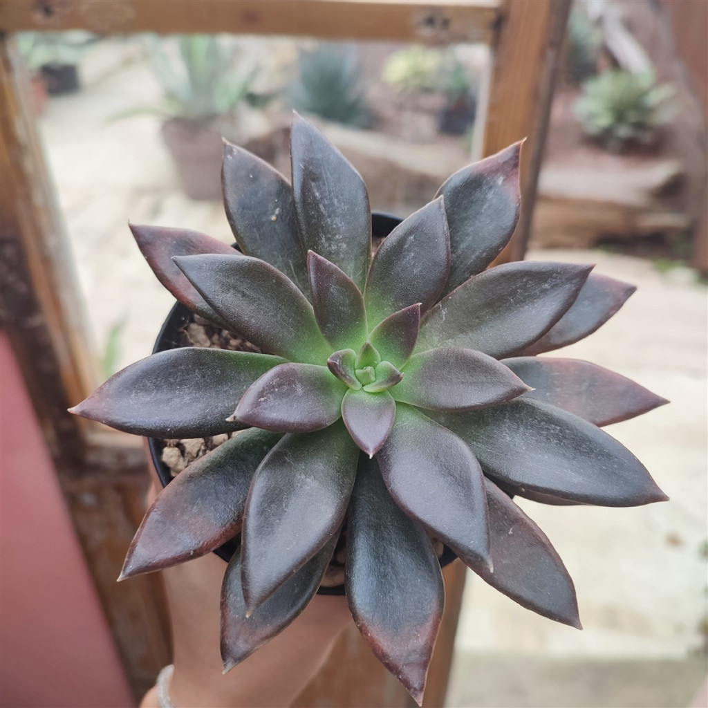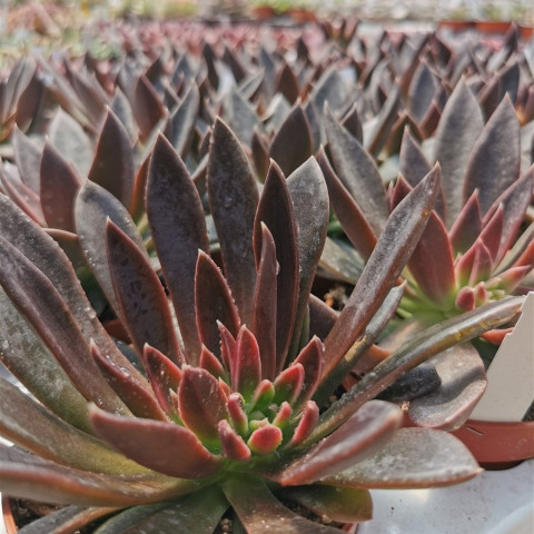 Echeveria ‘Serrana’, koyu bordo ile mor arasında değişen yaprak tonları ve yoğun çiçeklenme potansiyeli ile dikkat çeken kompakt bir hibrittir. Echeveria carnicolor and Echeveria affinis melezlenmesi sonucu ortaya çıkmıştır. Rozet yapısı sıkı ve katmanlıdır; yapraklar etli, dar ve uca doğru sivrilen formdadır. Işık yoğunlaştıkça yaprak rengi daha koyu ve derin bir tona ulaşır. Yeterli aydınlıkta bitki neredeyse çikolata kahvesine yakın, mat bir görünüm sergileyebilir. Merkezdeki genç yapraklar genellikle biraz daha yeşilimsi başlar, zamanla dış yapraklarla aynı koyu tona yaklaşır. Bu tür, zamanla hafif gövde uzaması gösterebilir ve yan sürgünler oluşturarak daha yayvan bir görünüm alabilir. Rozet çapı genellikle 8–12 cm aralığındadır, ancak çiçek sapları oldukça uzun ve gösterişli olabilir. Çiçeklenme döneminde ince, uzayan saplar üzerinde küme halinde pembe ve turuncu tonlarda çan formuna yakın, yıldızsı görünümlü çiçekler açar. Çiçek rengi ile koyu yaprak tonu arasında güçlü bir kontrast oluşur. Bu yoğun çiçeklenme özelliği bitkinin en ayırt edici yönlerinden biridir.