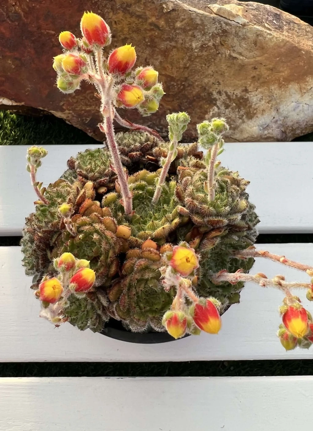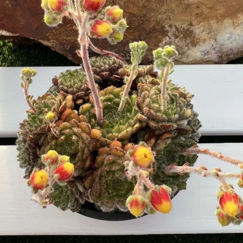 Çoğaltma genellikle yavru rozetlerin ayrılması yoluyla yapılır. Yan sürgünler ana bitkiden dikkatlice ayrılır ve birkaç gün kesik yüzey kurutulduktan sonra geçirgen karışıma dikilir. Yaprak çeliği yöntemi de uygulanabilir; ancak rozet ayırma daha hızlı ve güvenilir sonuç verir. Gübreleme yalnızca ilkbaharda ve düşük dozda yapılmalıdır. Sukulentler için dengeli içerikli besinler tercih edilir. Aşırı gübreleme, dokunun gevşemesine ve doğal kompakt yapının bozulmasına neden olabilir. Çiçeklenme döneminde ince ve dik çiçek sapları gelişir. Sap üzerinde sarkık, çan biçimli çiçekler oluşur. Çiçekler genellikle turuncu tonlarında olup uç kısımları sarımsı olabilir. Çiçeklenme, bitkinin genel sağlığı ve aldığı ışık düzeyiyle ilişkilidir.