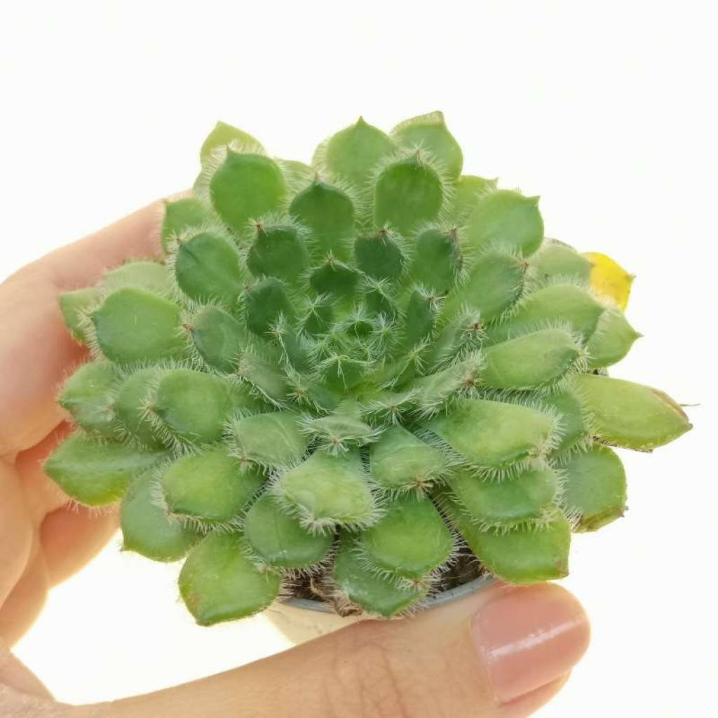 Yapraklar kısa, geniş ve spatula formuna yakındır. En ayırt edici özellik, yaprak yüzeyini ve kenarlarını kaplayan beyazımsı ince tüylerdir. Bu tüyler, bitkiye mat ve yumuşak görünümlü bir doku kazandırır. Aynı zamanda doğal habitatta güneş ışığına ve su kaybına karşı koruyucu işlev görür. Ana renk açık yeşil ile gri-yeşil tonları arasında değişir. Yüksek ışık altında uç kısımlarda hafif kırmızımsı renklenme görülebilir. Düşük ışıkta rozetler gevşer ve tüy yoğunluğu görsel olarak daha az belirgin hale gelebilir. Işık ihtiyacı yüksektir ancak yoğun ve yakıcı öğle güneşine ani maruz kalma yaprak yüzeyinde yanıklara neden olabilir. Güçlü aydınlık alan, kompakt rozet oluşumunu destekler. İç mekânda yetiştirilecekse en aydınlık pencere önü tercih edilmelidir. Açık alanda sabah güneşi uygundur. Yetersiz ışıkta rozetler arası mesafe artabilir ve form bozulabilir.