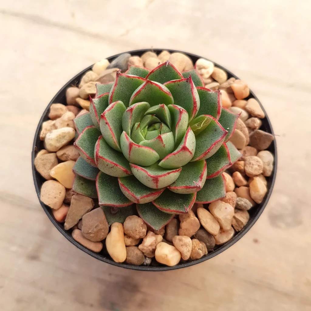 Echeveria ‘Shamrock’, yoğun kırmızı beneklenme, belirgin kırmızı kenar hattı ve sıkı rozet formuyla dikkat çeken güçlü karakterli bir hibrittir. Echeveria 'Shamrock', Echeveria purpusorum ile belirtilmemiş bir Echeveria türünün melezidir. Işık stresi altında adeta renk patlaması yaşar ve yeşil zemin üzerinde kırmızı desenler dramatik biçimde belirginleşir. Kompakt yapısı ve kümelenme eğilimi sayesinde saksı içinde dolgun bir görünüm oluşturur. Yapraklar kısa, kalın ve sivri uçludur. Zemin rengi açık yeşilden zeytin tonlarına kadar değişebilir. Yaprak yüzeyinde kırmızı benekler ve ince kenar hattı bulunur. Bu benekler düzensiz dağılım gösterir ve özellikle yüksek ışık altında yoğunlaşır. Yaprak uçları keskin ve kırmızıya dönüktür. Spiral dizilim merkezden dışa doğru sık bir geometri oluşturur. Sağlıklı yetiştirilen örneklerde rozet oldukça kompakt kalır.