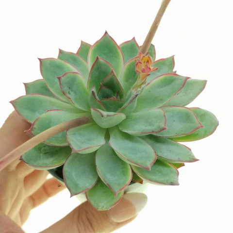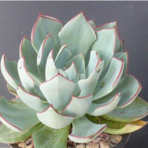 Echeveria strictiflora, Crassulaceae familyasına ait, yaprak kenarlarındaki belirgin renk hattı ile tanınan bir sukulenttir. Amerika Birleşik Devletleri ana vatanı olan tek Echeveria türüdür. Bitki kısa gövdeli olup yapraklar merkezden düzenli spiral dizilimle çıkar ve kompakt bir rozet oluşturur. Uygun koşullarda dipten yavru sürgünler geliştirebilir, ancak çoğalma hızı bazı hibrit türlere kıyasla daha kontrollüdür. Echeveria strictiflora yaprakları kalın, etli ve su depolama kapasitesi yüksek yapıdadır. Yaprak formu geniş mızrak biçiminde ve uç kısımlar belirgin şekilde sivridir. Yaprak yüzeyi genellikle açık mavi-yeşil ile gri-yeşil arasında değişen tonlar sergiler. Yeterli ışık koşullarında yaprak kenarlarında pembe ya da kırmızımsı bir hat belirginleşir. Bu kenar pigmentasyonu türün ayırt edici özelliklerinden biridir. Düşük ışıkta renk daha soluk hale gelir ve kenar çizgisi zayıflar. Yaprak yüzeyinde ince bir farina tabakası bulunabilir; bu doğal kaplama su kaybını azaltmaya yardımcı olur. Sürekli nemli ortam kök ve alt yapraklarda çürüme riskini artırabilir.