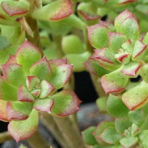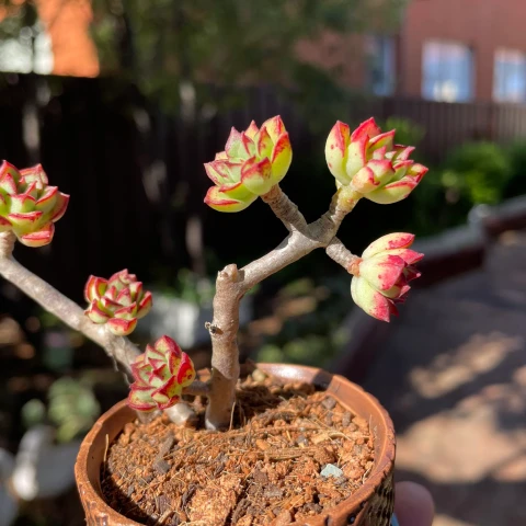 Çiçeklenme döneminde rozet merkezinden ince çiçek sapları gelişir. Sap üzerinde küçük, çan formunda ve kırmızı ve sarı tonlarda çiçekler oluşur. Çiçeklenme; bitkinin yaşı, ışık miktarı ve genel bakım koşullarına bağlıdır. Çoğaltma işlemi tepe çeliği veya yan dalların kesilmesiyle yapılabilir. Kesim sonrası yara yüzeyinin kuruması beklenmeli, ardından drenajlı bir karışıma yerleştirilmelidir. Gövde oluşturan yapısı nedeniyle tepe kesimiyle daha kompakt form elde edilebilir. Gübreleme yalnızca ilkbaharda ve düşük dozda uygulanmalıdır. Sukulentler için dengeli içerikli besinler tercih edilmelidir. Aşırı besin uygulaması hızlı fakat zayıf büyümeye neden olabilir. Kontrollü gübreleme, yaprak renklenmesinin korunmasına ve sağlıklı gelişime katkı sağlar.