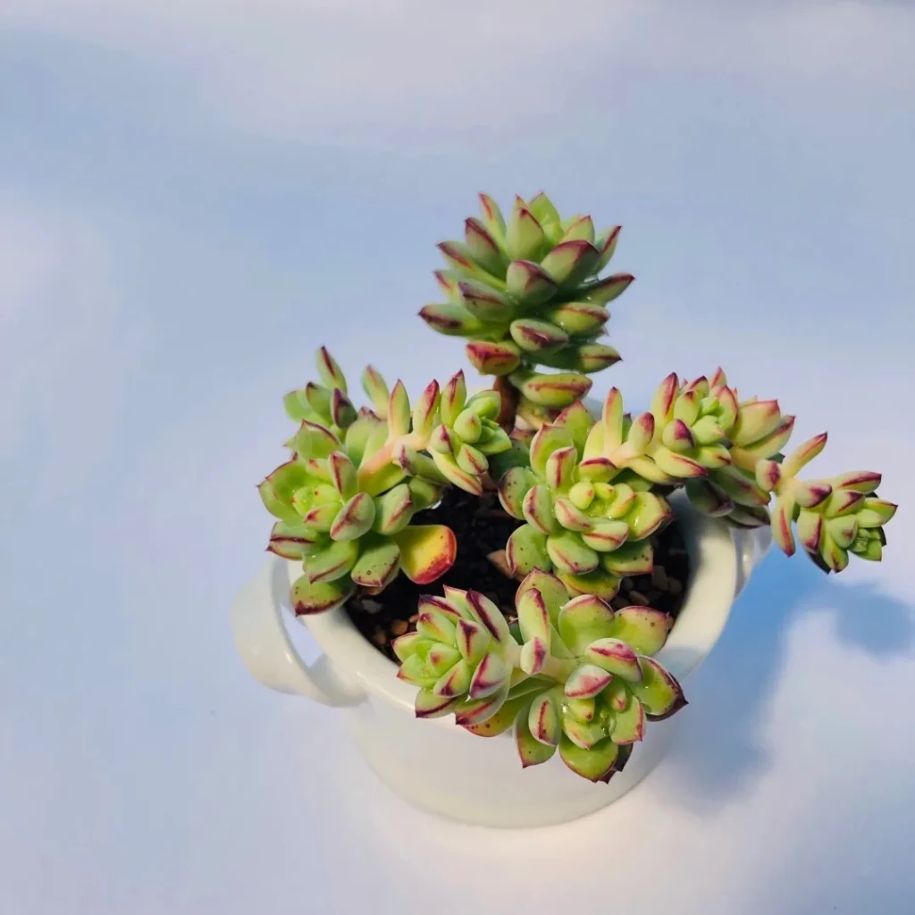 Echeveria ‘Supia’, klasik rozet formundan farklı olarak zamanla gövde oluşturan ve dallanma eğilimi gösterebilen bir kültivardır. Oluşturan türler bilinmemektedir. Bitki genç dönemde kompakt rozetler oluşturur; ilerleyen yaşlarda alt yaprakların dökülmesiyle birlikte gövde belirginleşir ve küçük bir ağaç formuna yaklaşan yapı gelişebilir. Yapraklar etli, kalın ve ters yumurta formuna yakın yapıdadır. Ana renk parlak açık yeşildir. Uç kısımlarda ve kenarlarda kırmızımsı çizgiler veya üçgensel lekeler oluşur. Işık miktarı arttıkça bu kırmızı pigmentasyon daha belirgin hale gelir. Yaprak yüzeyi pürüzsüzdür ve hafif parlak bir dokuya sahiptir. Farina tabakası belirgin değildir; bu nedenle yapraklar dokunmaya karşı daha dayanıklıdır ancak yine de gereksiz fiziksel temastan kaçınılmalıdır. Işık gereksinimi yüksektir. Gün boyunca parlak ve dolaylı ışık sağlanmalıdır. Sabah güneşi tolere edilebilir; yoğun ve uzun süreli öğle güneşi yaprak yanıklarına yol açabilir. Yetersiz ışıkta gövde uzaması artar, rozetler gevşer ve yaprak aralıkları açılır. Dengeli ışık, kompakt ve sağlıklı gelişimi destekler.
