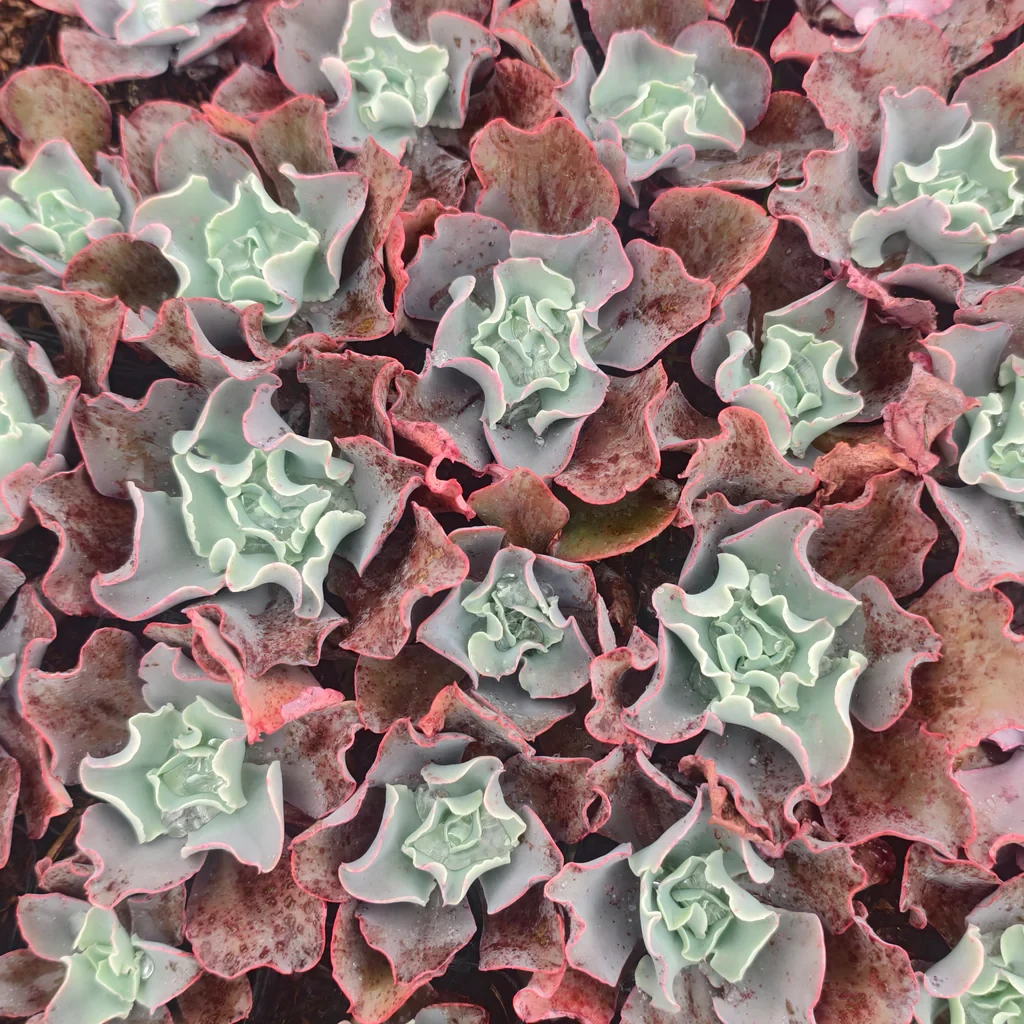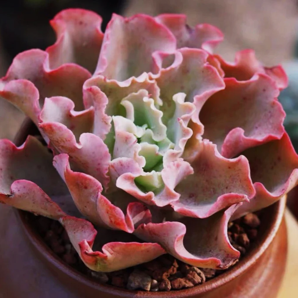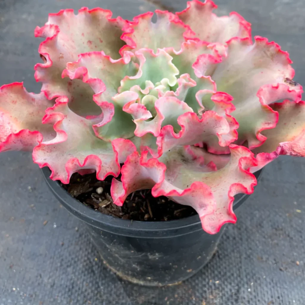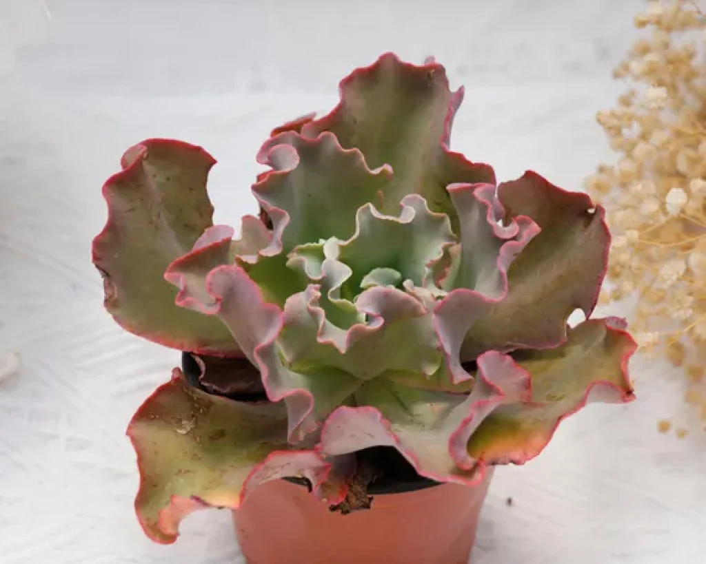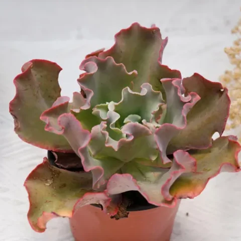 Echeveria ‘Takasago No Okina’, dalgalı ve kıvrımlı yaprak kenarlarıyla ayırt edilen, gösterişli rozet formuna sahip bir kültivardır. Yaprak kenarlarının belirgin şekilde fırfırlı olması bu bitkiye hareketli ve heykelsi bir görünüm kazandırır. Rozet genellikle orta boyutlara ulaşır ve dengeli bir spiral dizilim gösterir. Genç bitkilerde daha kompakt bir yapı gözlenirken, olgun bitkilerde rozet çapı genişler ve katmanlar daha belirgin hale gelir. Yapraklar geniş, etli ve hafif spatula formundadır. Ana renk açık yeşil ile gri-yeşil arasında değişir. Işık yoğunluğuna bağlı olarak kenar hatlarında pembe veya kırmızımsı bir kontur gelişir. Bu renklenme özellikle serin ve aydınlık koşullarda daha belirgin hale gelir. Yaprak yüzeyi pürüzsüzdür ve hafif mat bir görünüm sergiler. Kenar kıvrımları bitkiye hacim kazandırır; bu yapı aynı zamanda ışığın yaprak yüzeyinde farklı açılarla yansımasına neden olur.