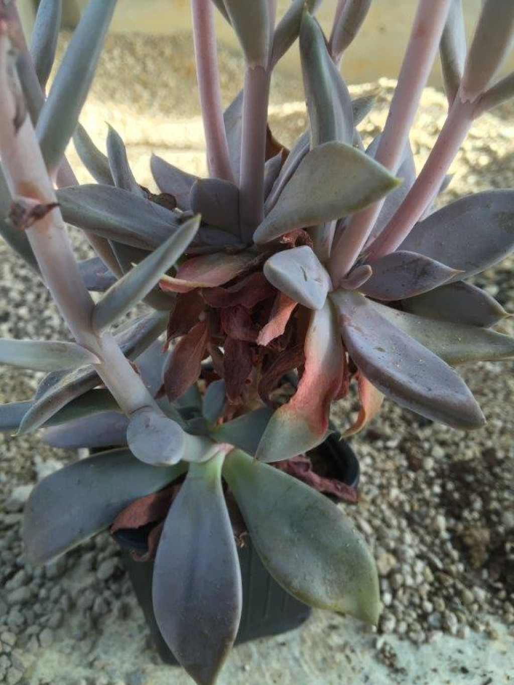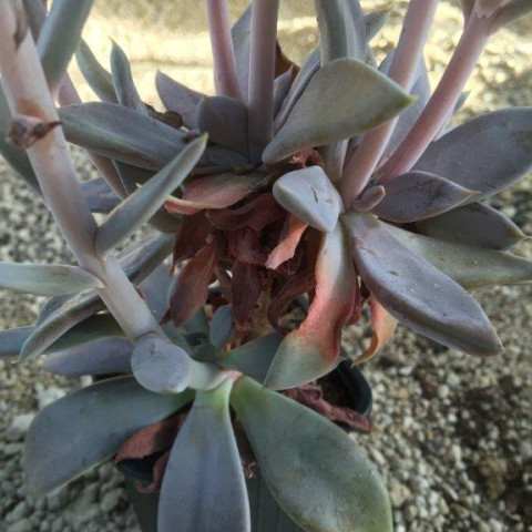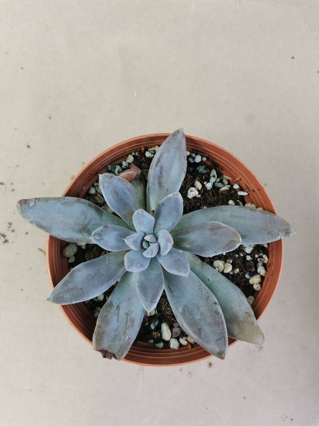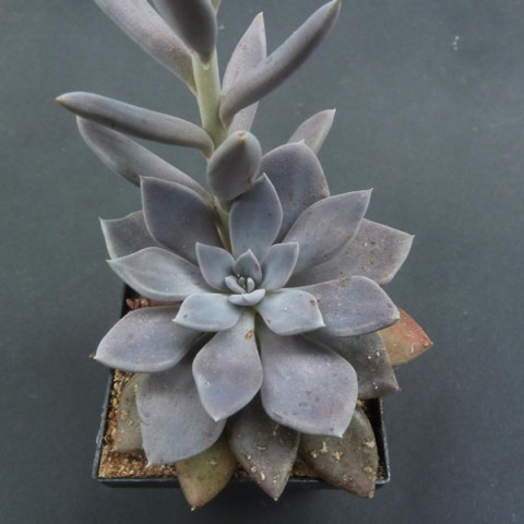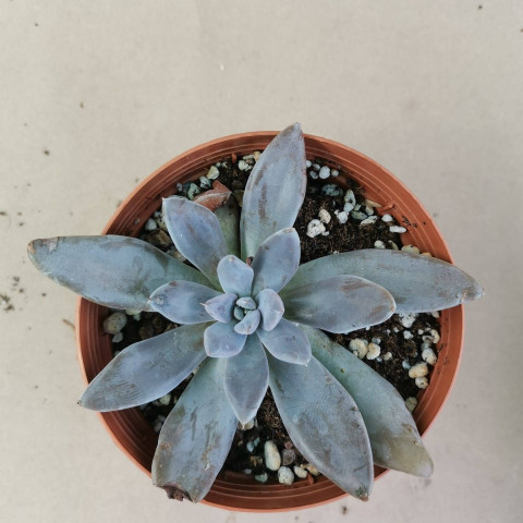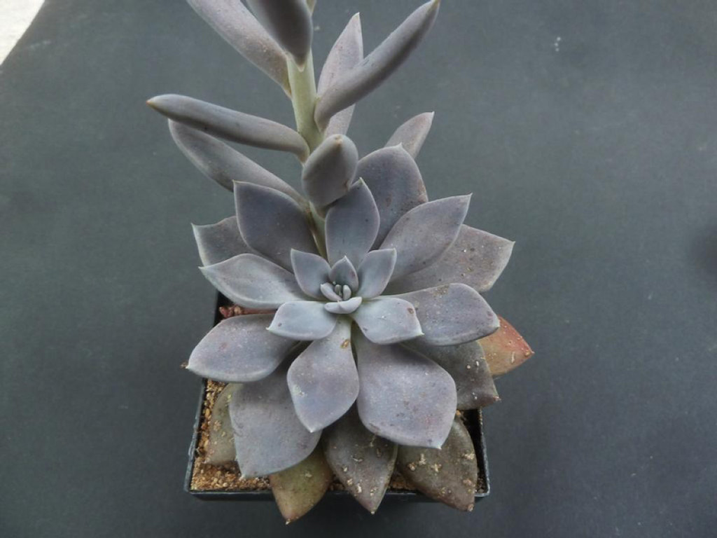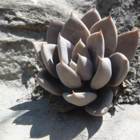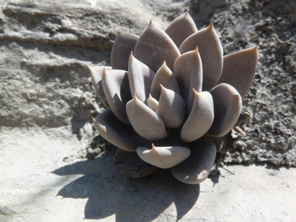 Echeveria trianthina, Crassulaceae familyasına ait, doğal yayılışı Meksika’ya dayanan kompakt yapılı bir türdür. Tür adı, çiçek yapısındaki özelliklere atıfta bulunur. Doğal habitatında kayalık, geçirgen ve organik madde açısından zayıf topraklarda gelişim gösterir. Kuraklığa dayanıklı yapısı ve belirgin rozet formu ile koleksiyon değeri taşıyan türler arasında yer alır. Bitki kısa gövdeli olup sık dizilmiş yapraklardan oluşan düzenli bir rozet geliştirir. Uygun koşullarda rozet çapı genellikle 10–18 cm arasında değişir. Yapraklar kalın, etli ve geniş üçgen formundadır. Uç kısımlar belirgin sivridir. Yaprak yüzeyi açık gri-yeşil, mavi-yeşil veya hafif lavanta alt tonlu olabilir. Çoğu örnekte yaprak üzerinde ince bir farina tabakası bulunur; bu tabaka mat görünüm sağlar ve su kaybını azaltmaya yardımcı olur. Güçlü ışık koşullarında yaprak uçlarında hafif pembe veya bakır tonlar oluşabilir.