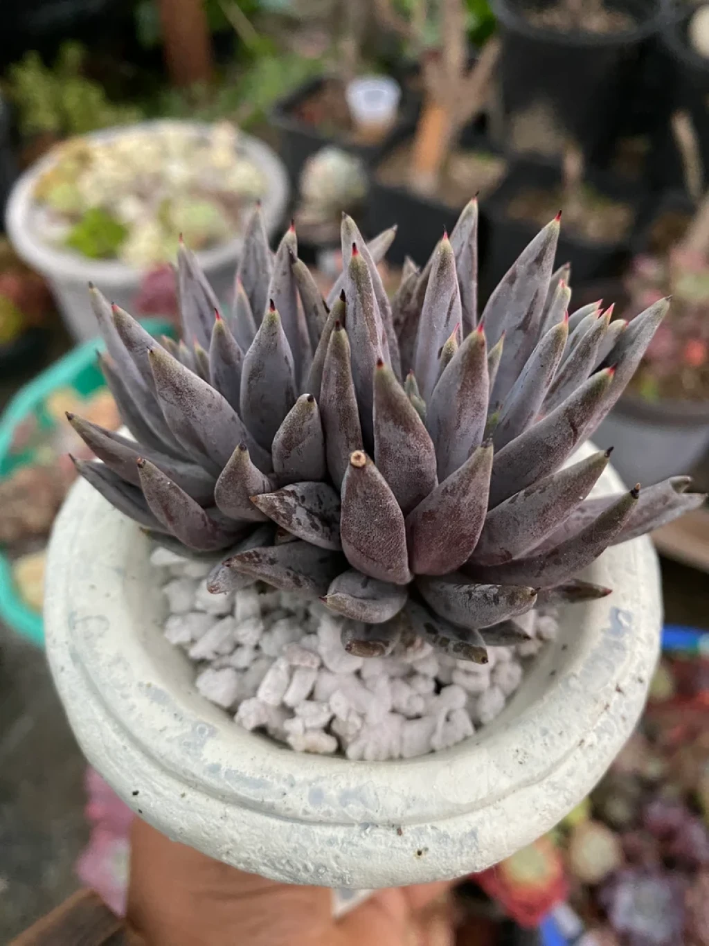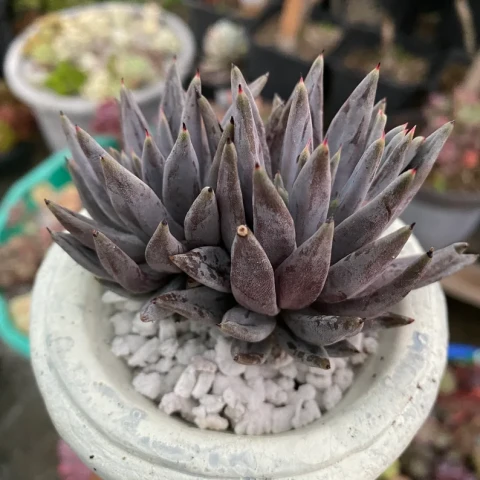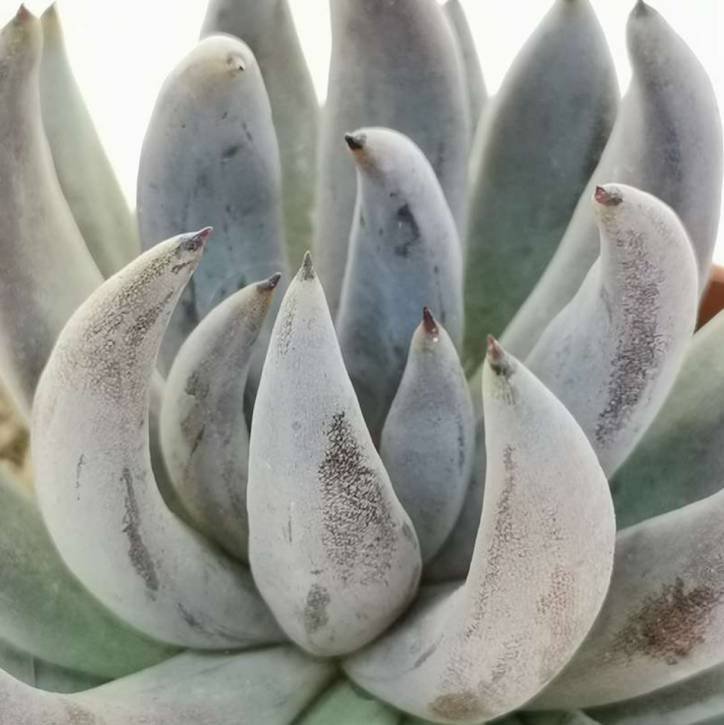 Echeveria unguiculata, Crassulaceae familyasına ait, Meksika kökenli ve morumsu tonlarıyla dikkat çeken kompakt yapılı bir Echeveria türüdür. Tür adı Latince “unguiculata” kelimesinden gelir ve “küçük tırnaklı” anlamını taşır; bu ifade, yaprak uçlarında görülen sivri ve koyu renkli çıkıntıya atıfta bulunur. Bitki sıkı, yoğun ve nispeten küçük rozetler oluşturur. Uygun koşullarda rozet çapı genellikle 8–15 cm arasında değişir. Yapraklar dar, uzun ve belirgin şekilde sivri uçludur. Uç kısımlarda çoğunlukla koyu mor ya da kırmızımsı bir ton görülür. Yaprak yüzeyi kalın bir farina tabakasıyla kaplıdır; bu pudramsı örtü bitkiye mat, gri-mavi ile lavanta arası bir görünüm kazandırır. Işık yoğunluğu arttıkça mor tonlar derinleşir ve yaprak uçlarındaki koyu renk daha belirgin hale gelir. Yetersiz ışıkta ise renkler soluklaşır ve rozet formu gevşeyebilir.
