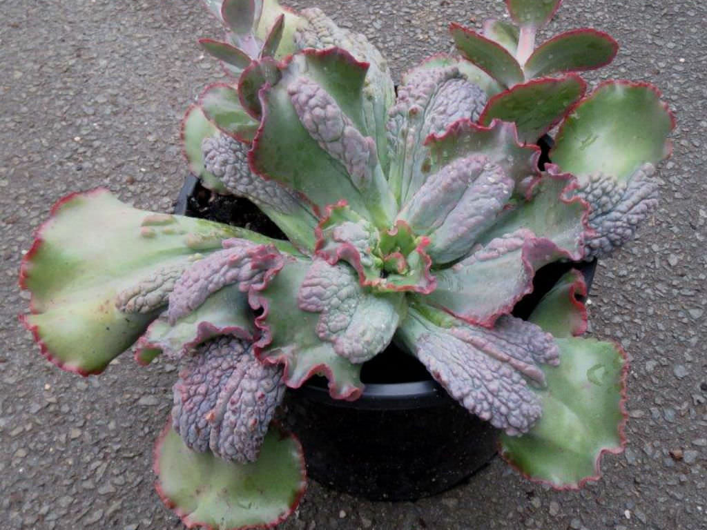 Echeveria ‘Virginia Lee’, sıra dışı yaprak dokusu ve belirgin kabartılı yüzeyi ile klasik rozet formundan farklı bir görünüm sunan bir hibrittir. Melezlendiği Echeveria türleri bilinmemektedir. Bu çeşit, standart ve düzgün yüzeyli Echeveria’lardan ayrılarak yaprak üzerinde belirgin, pütürlü ve kabarık çıkıntılar oluşturur. Sağlıklı gelişim gösteren bireylerde rozet gevşek ama dengeli bir form sergiler. Yapraklar merkezden dışa doğru yerleşir; ancak yüzey dokusu nedeniyle rozet görünümü daha hacimli ve dramatik algılanır. Yapraklar geniş, kalın ve etlidir. Kenarları hafif dalgalı yapı gösterebilir. En belirgin özellik, yaprak yüzeyindeki kabartılı ve siğilimsi görünümdür. Bu kabartılar genellikle yaprağın orta bölümünde yoğunlaşır ve zamanla daha belirgin hale gelebilir. Temel yaprak rengi açık gri-yeşil ile pastel yeşil arasında değişir. Yaprak kenarlarında ince kırmızı ya da pembe bir hat oluşabilir. Güçlü ışık altında bu kenar renklenmesi daha belirgin hale gelir. Serin geceler ve aydınlık ortam pigmentasyonu desteklerken, düşük ışıkta kırmızı tonlar zayıflayabilir.