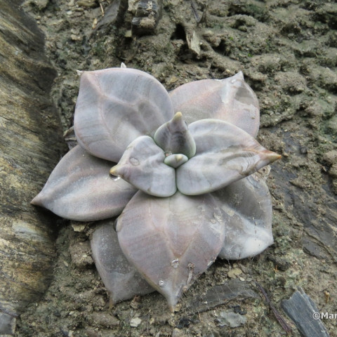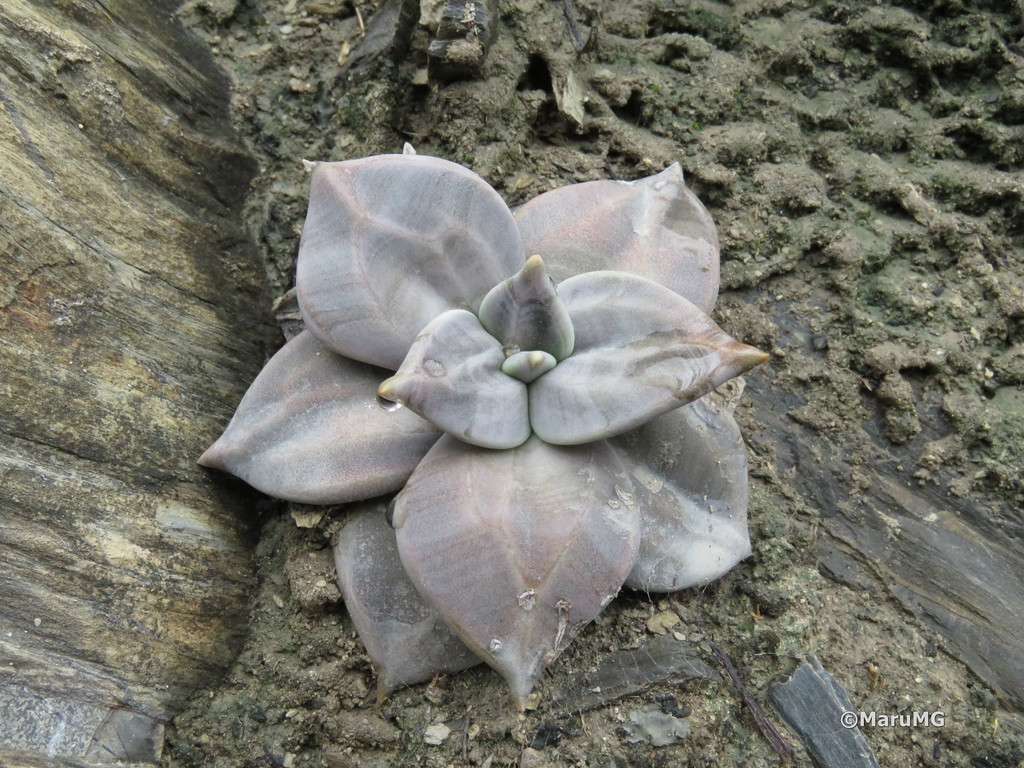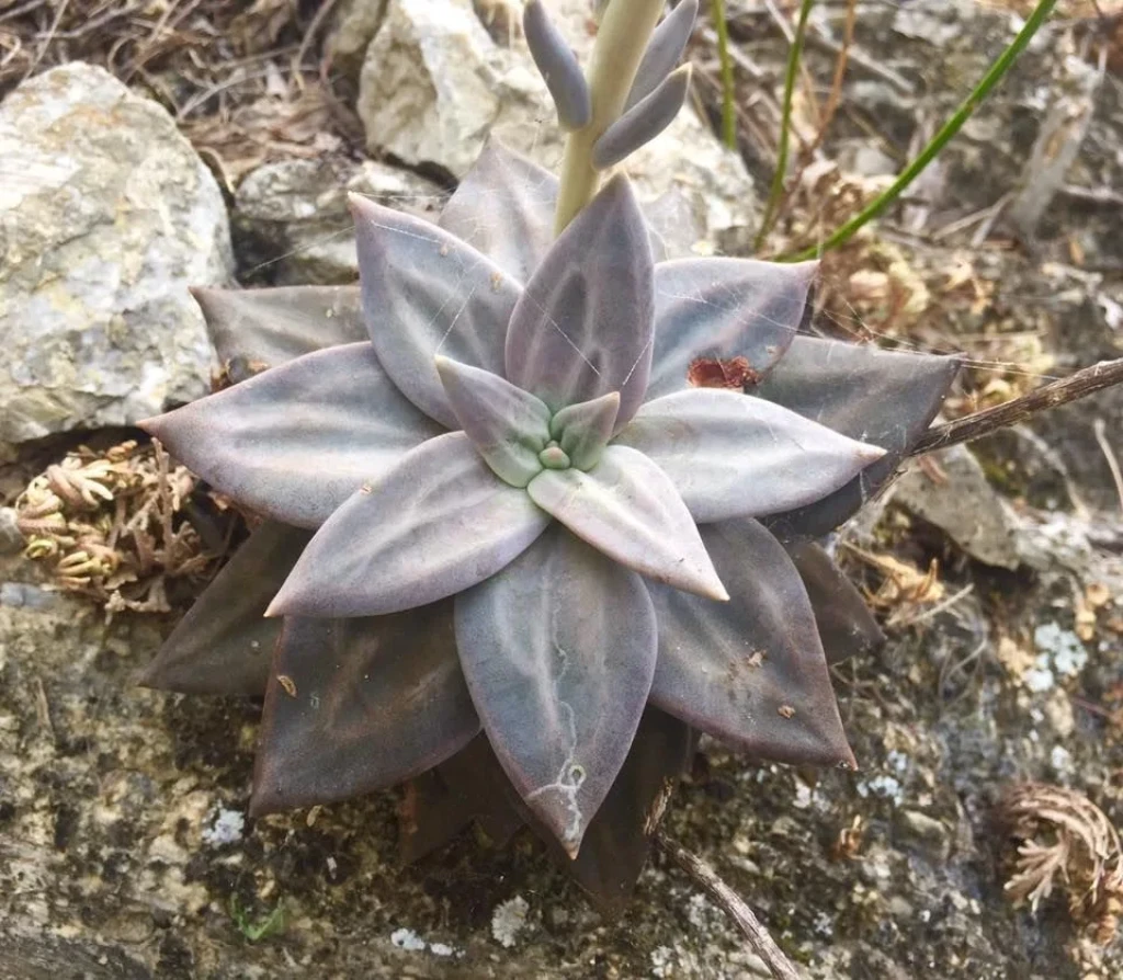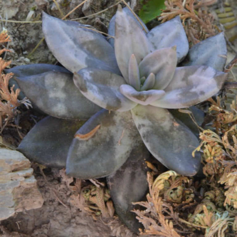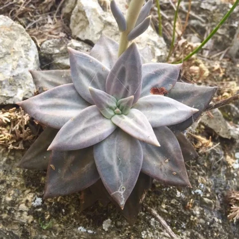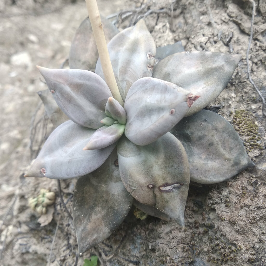 Echeveria xichuensis, adını Meksika’nın Guanajuato eyaletindeki Xichú bölgesinden alan, doğal yayılışı sınırlı bir Echeveria türüdür. Crassulaceae familyasına ait olan bu tür, kayalık ve eğimli arazilerde, ince toprak tabakalarının bulunduğu çatlaklarda gelişim gösterir. Doğal ortamındaki yüksek ışık ve iyi drenaj koşulları, bitkinin morfolojik özelliklerini belirgin biçimde şekillendirir. Bitki kompakt ve simetrik rozetler oluşturur. Rozet çapı genellikle 8–15 cm arasında değişir. Yapraklar kalın, üçgensi ve belirgin sivri uçludur. Yaprak yüzeyinde ince bir farina tabakası bulunur; bu mumsu kaplama bitkiye mat, gri-mor ya da lavanta tonlarında bir görünüm kazandırır. Işık yoğunluğuna bağlı olarak yaprak rengi gri-mor, dumanlı lila ya da koyu grimsi tonlara dönüşebilir. Düşük ışıkta ise renk daha açık ve yeşilimsi kalır. Yaprak uçlarında hafif koyulaşma görülebilir.