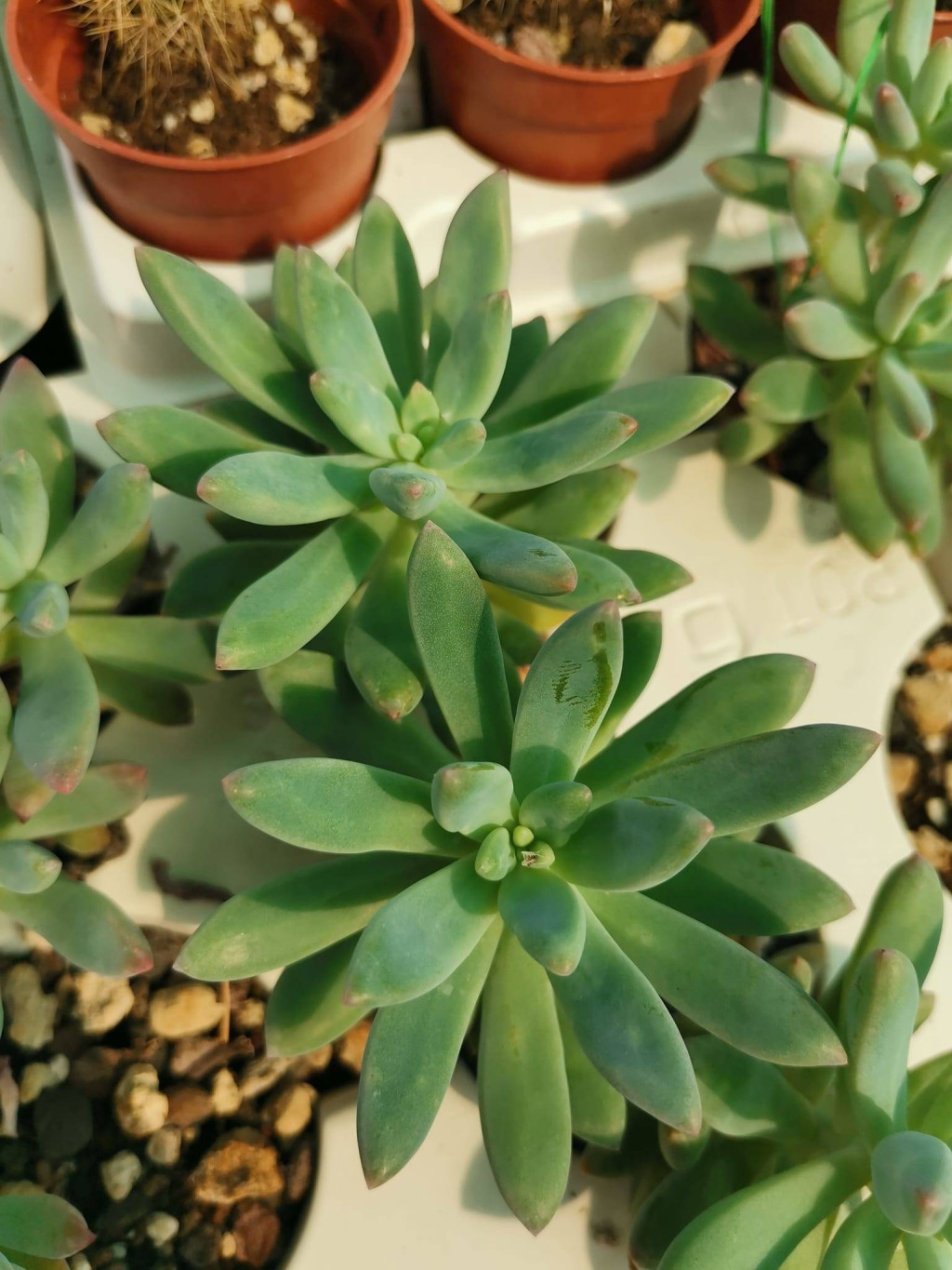 ×Graptosedum ‘Daniel-san’, Crassulaceae familyası içinde yer alan ve Graptopetalum paraguayense ile hangisi olduğu belirtilmeyen bir Sedum türü arasında oluşturulmuş hibrit bir kültivar olarak tanımlanır; kompakt rozet yapısı, yoğun etli dokusu ve ışık koşullarına duyarlı renklenme özelliğiyle koleksiyon sukulentleri arasında dikkat çeker. Bitki genellikle kısa ve kalın bir gövde üzerinde sıkı dizilmiş rozetler oluşturur; yapraklar orta boylu, spatula ile oval arası formda, uçlara doğru hafif sivrilen bir yapıya sahiptir. Yaprak rengi temel olarak açık yeşil ile mavi-yeşil tonları arasında değişir; yoğun ışık, serin gece sıcaklıkları ve kontrollü sulama koşullarında uç ve kenar bölgelerde pembe, mercan veya kızıl tonlar ortaya çıkabilir, düşük ışıkta ise renkler soluklaşır ve yapraklar daha gevşek bir dizilim gösterebilir.
