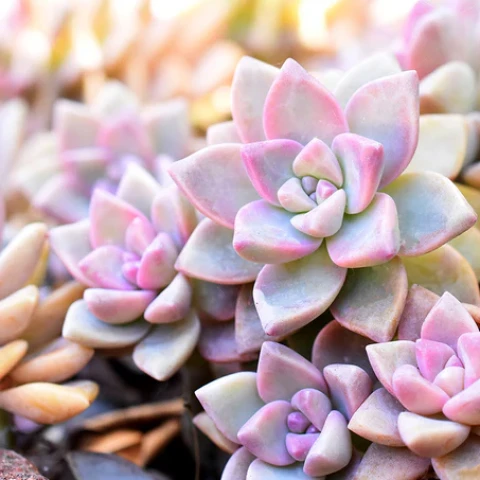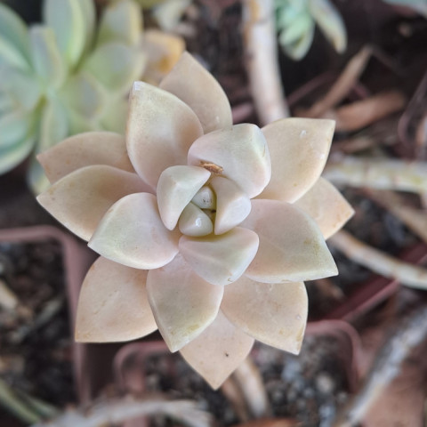 Graptosedum ‘Ghosty’, Crassulaceae familyasına ait, Graptopetalum paraguayense ve belirtilmemiş bir Sedum türü arasında elde edilmiş bir melezdir. Doğal bir tür değildir. Seçilmiş hatlar üzerinden çoğaltılmıştır. Bitki rozet formunda gelişir. Rozetler kısa gövdeler üzerinde yer alır ve zamanla yan sürgünler oluşturarak kümelenme eğilimi gösterir. Genel görünüm kompakt ve dengelidir. Gelişim hızı orta seviyededir. Graptosedum ‘Ghosty’ yaprakları etli, kalın ve spatula ile oval form arasında değişen bir yapı sergiler. Yapraklar rozet düzeni içinde sık dizilimlidir. Yaprak yüzeyi pürüzsüzdür ve belirgin bir mumsu tabaka ile kaplıdır. Bu tabaka yapraklara mat, pudramsı bir görünüm kazandırır. Yaprak rengi çoğunlukla soluk gri, açık mavi ve beyaza yakın tonlar arasında değişir. Yüksek ışık koşullarında pembe veya lavanta tonlarında renklenmeler görülebilir. Yaprak dokusu su depolamaya uygundur.