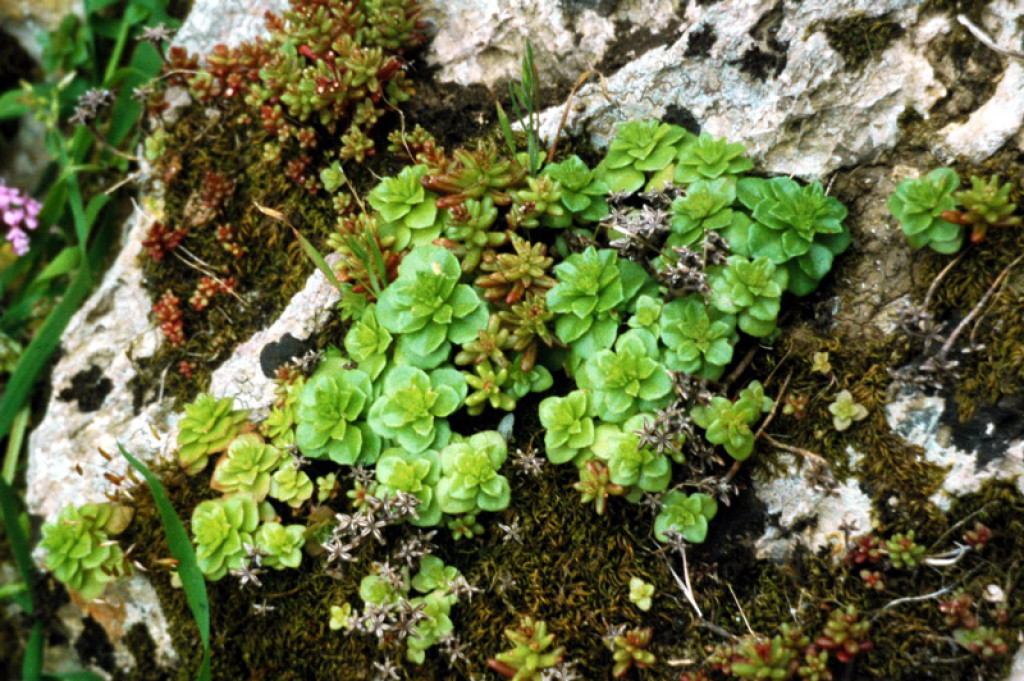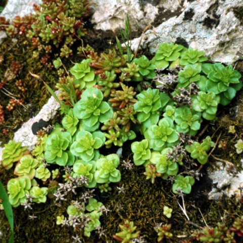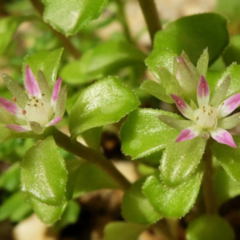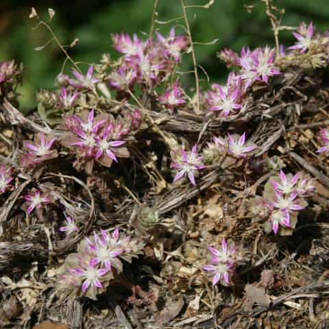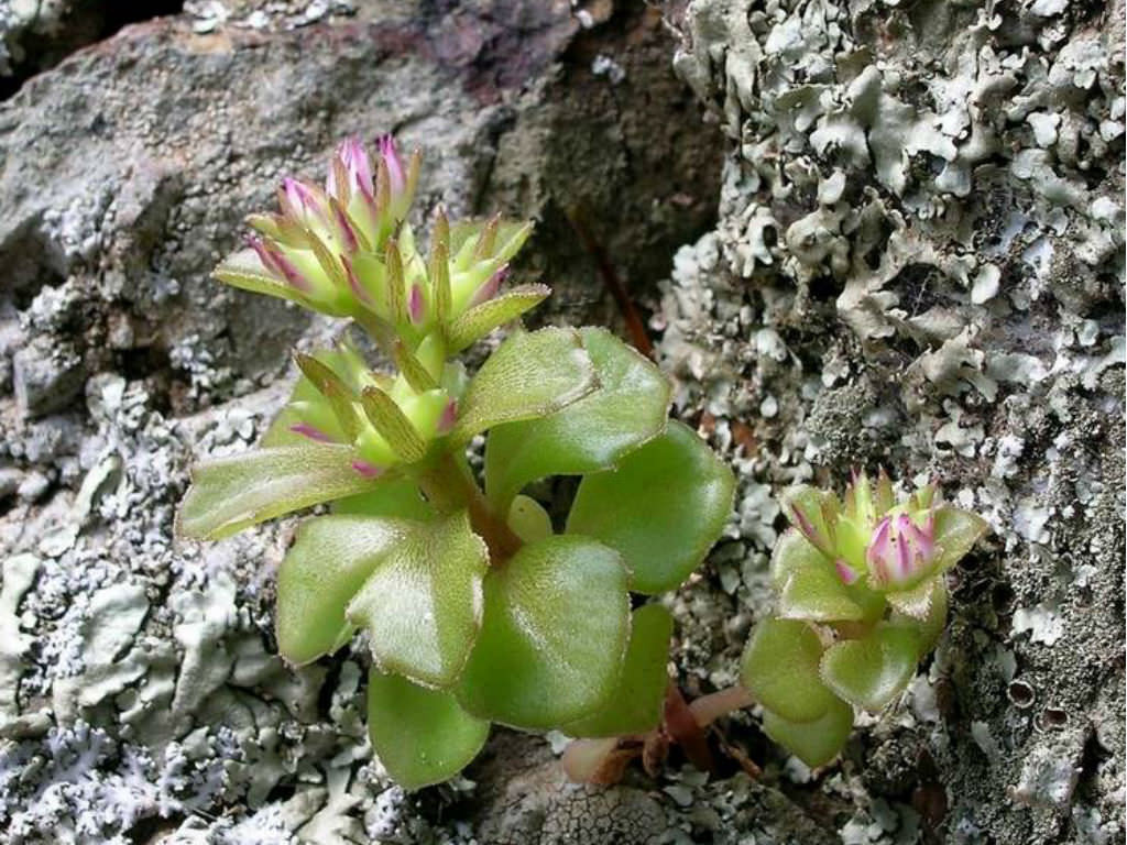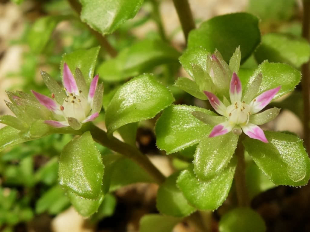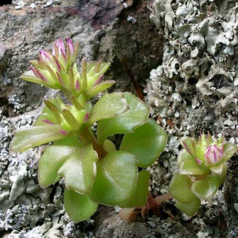 Phedimus stellatus, Crassulaceae (damkoruğugiller) familyasına ait, çok yıllık, alçak gelişimli ve yayılıcı karakteri belirgin bir sukulent türüdür. Yer örtücü yapısı sayesinde kaya bahçeleri, taş araları ve eğimli zeminlerde doğal bir bitki örtüsü oluşturur. Bitkinin gövdeleri etli, kısa boğumlu ve yere yakın şekilde yatay yönde gelişir. Gövdeler toprağa temas ettikleri noktalardan kolaylıkla köklenir. Bu özellik, Phedimus stellatus’un zamanla geniş alanlara yayılmasını ve sık dokulu bir yapı kazanmasını sağlar. Gövde dokusu yumuşak fakat dayanıklıdır ve büyüme sezonu boyunca formunu korur. Yapraklar etli, dolgun ve su depolama kapasitesi yüksek yapıdadır. Yaprak dizilimi çoğunlukla almaşıktır. Yaprak formu ovalden spatula biçimine kadar değişebilir. Yaprak uçları yuvarlak ya da hafif küt yapıdadır. Yaprak yüzeyi pürüzsüzdür. Büyüme döneminde yaprak rengi canlı yeşil tonlarında görülür. Yoğun güneş ışığına maruz kalındığında veya serin hava koşullarında yapraklarda sarımsı, bronz ya da hafif kızıl tonlara doğru renk değişimleri oluşabilir. Bu renklenme, bitkinin çevresel koşullara verdiği doğal bir adaptasyon tepkisidir. Phedimus stellatus’un çiçekleri, türün adını çağrıştıracak şekilde yıldız formunda ve sade görünümlüdür. Çiçeklenme dönemi genellikle ilkbahar sonu ile yaz başı arasında gerçekleşir. Çiçekler pembe tonlarda açar.