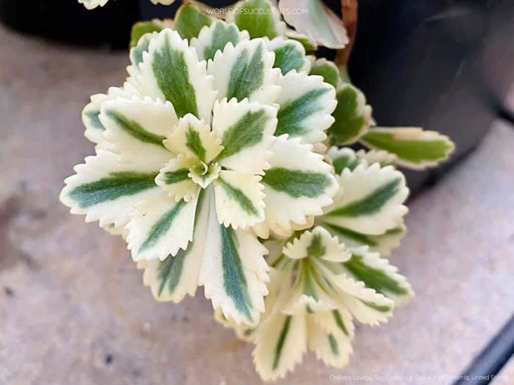 Phedimus takesimensis ‘Atlantis’, Crassulaceae (damkoruğugiller) familyasına ait, çok yıllık, alçak boylu ve güçlü yer örtücü özelliğe sahip, alacalı yapraklı bir kültivardır. Türün doğal kökeni, Phedimus takesimensis, Kore’ye bağlı Ulleungdo (Takeshima) Adası’na dayanır; ‘Atlantis’ ise seçilim yoluyla elde edilmiş, yaprak desenleriyle ayırt edilen bir varyetedir. Bitkinin gövdeleri etli, kısa boğumlu ve yatay yönde ilerleyicidir. Gövdeler toprağa temas ettikleri noktalardan kolaylıkla köklenir; bu özellik, bitkinin zaman içinde düzenli ve kontrollü bir şekilde yayılmasını sağlar. ‘Atlantis’ kültivarında gövdelerin dikey uzaması sınırlıdır; bitki alçak ve kompakt formunu korur. Yapraklar etli, dolgun ve su depolama kapasitesi yüksek yapıdadır. Yaprak formu ovalden spatula biçimine kadar değişebilir; uçlar yuvarlak ya da hafif küt yapıdadır. En belirgin ayırt edici özellik, yaprakların merkezinin mavi-yeşil tonlarda, kenarlarının ise geniş, krem-sarı bir alacalanma göstermesidir. Yoğun güneş ışığında bu açık kenarlar daha belirgin hâle gelir; serin dönemlerde merkez renklerde hafif pembe ya da bronz yansımalar görülebilir. Bu renklenme, bitkinin sağlıklı adaptasyonunun doğal bir sonucudur.