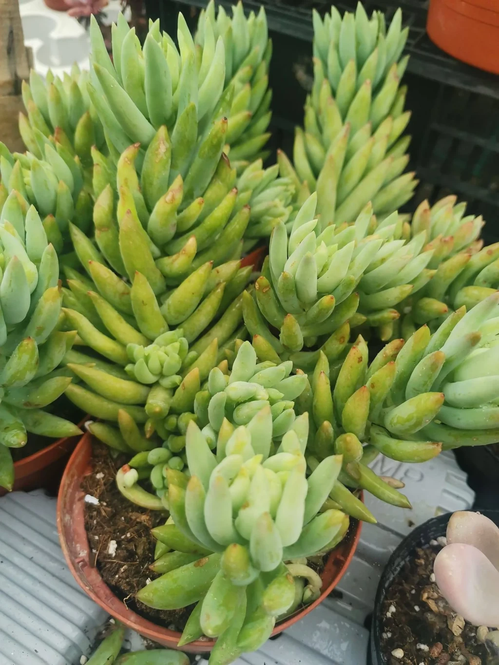 Sedeveria ‘Harry Butterfield’, Sedum morganianum ve Echeveria derenbergii cinslerinin melezlenmesiyle elde edilmiş, yoğun şekilde kümelenen ve zamanla sarkıcı form kazanan bir sukulent hibrittir. Bu kültivar, hızlı çoğalma eğilimi ve çok sayıda rozet oluşturma kapasitesi ile dikkat çeker. Özellikle geniş alanlara yayılan, dolgun ve hacimli görünüm oluşturan yapısı sayesinde dekoratif açıdan güçlü bir etkiye sahiptir. Yapraklar etli, silindirik-oval formda ve uçlara doğru hafif sivrilen yapıdadır. Rozetler oldukça sık dizilir ve zamanla birbirine yakın şekilde kümelenerek kompakt bir yapı oluşturur. Yaprak yüzeyi genellikle mat ve pürüzsüzdür. Renk yapısı açık yeşil tonlarındadır; ancak güçlü ışık altında uç kısımlarda hafif sarımsı veya altın tonlarına dönüşüm gözlemlenebilir. Bu renk değişimi, bitkinin ışık adaptasyonuna verdiği doğal bir tepkidir ve estetik değerini artırır.