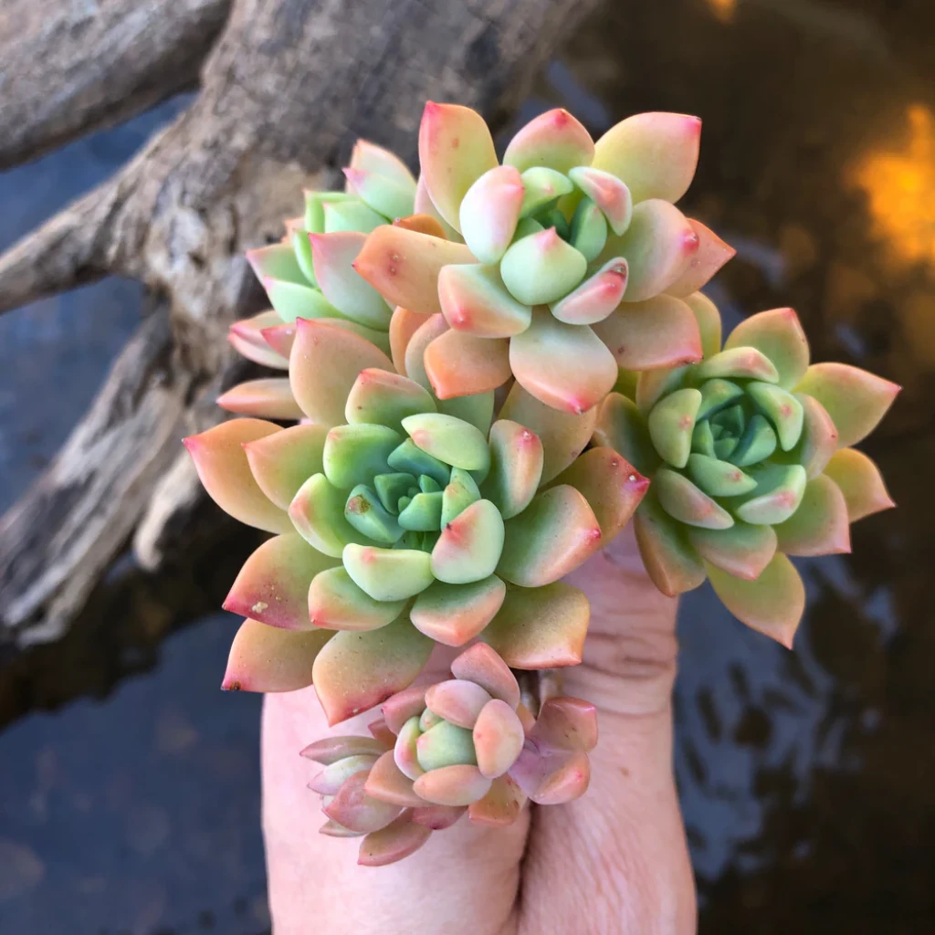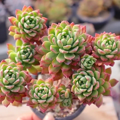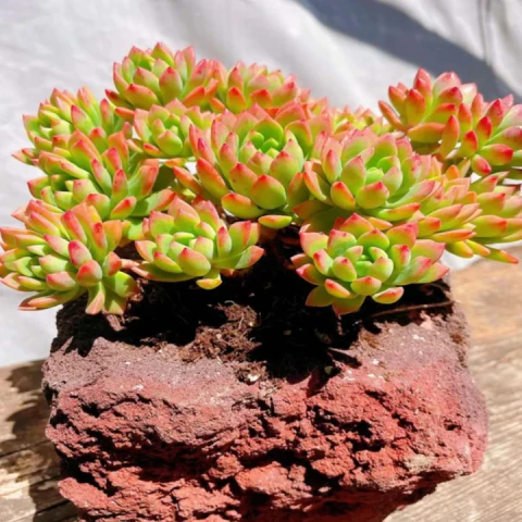 Gelişim formu başlangıçta tek rozet şeklindedir. Zamanla dipten yeni sürgünler oluşturarak hızla kümelenir. Bu sürgünler birbirine yakın geliştiği için bitki sıkı ve kompakt bir yapı oluşturur. Yayılma eğilimi yüksek olsa da formunu koruyarak genişler. Bu özellik, özellikle saksı düzenlemelerinde veya kaya üstü kompozisyonlarda bitkinin tercih edilmesini sağlar. Aydınlatma, bu türün hem formunu hem de renk kalitesini belirleyen en önemli faktördür. Yeterli ışık altında rozetler daha sıkı olur ve yapraklar kalınlaşır. Aynı zamanda kırmızı uç pigmentasyonu maksimum seviyeye ulaşır. Yetersiz ışıkta ise rozet yapısı gevşer, yaprak aralıkları açılır ve bitki estetik formunu kaybeder.