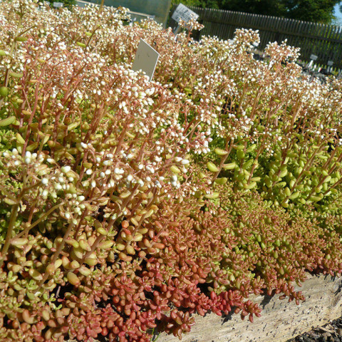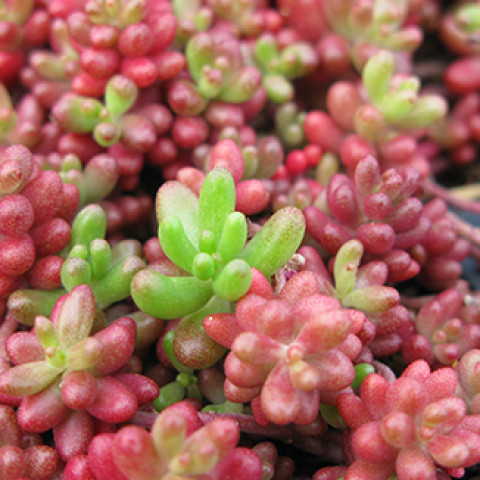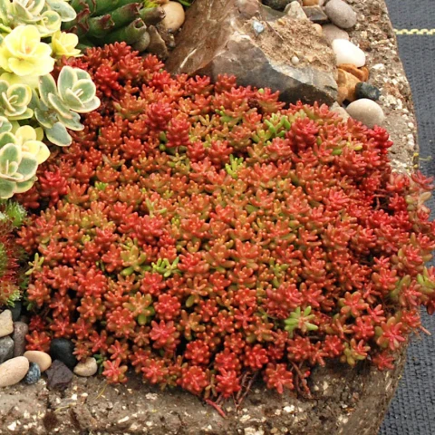 Sedum album ‘Coral Carpet’, Crassulaceae familyasına ait, yayılıcı gelişim gösteren ve özellikle yer örtücü olarak kullanılan kompakt yapılı bir Sedum album kültivarıdır. Bitki kısa, sık dallanan sürgünler üzerinde dizilen küçük, etli ve oval yapraklara sahiptir. Bu yapraklar ilkbahar ve yaz başında canlı yeşil tonlarda görülürken yoğun güneş ışığı, serin geceler veya hafif kuraklık koşullarında mercan pembesi, bakır ve kızıl tonlara dönüşerek kültivara adını veren halı benzeri renkli bir görünüm kazandırır. Gelişimi yatay yönde ilerler ve zamanla saksı yüzeyini ya da bahçe alanını tamamen kaplayabilen sık bir doku oluşturur. Toprak seçimi bakım açısından kritik olup suyu hızlı tahliye eden, mineral oranı yüksek bir kaktüs–sukulent karışımı tercih edilmelidir. Ağır ve uzun süre ıslak kalan topraklar kök çürümesine ve gövde yumuşamasına neden olabilir. Sulama yalnızca toprak tamamen kuruduğunda yapılmalı, özellikle yaz aylarında sık ama yüzeysel sulamadan kaçınılmalı, kış döneminde ise sulama minimum seviyeye indirilmelidir.