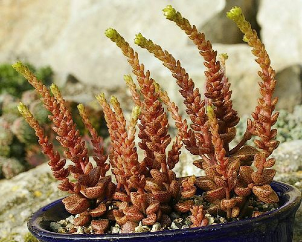 Sedum caducum için kaktüs – sukulent karışımı, geçirgenliği yüksek bir toprak tercih edilmelidir. Toprağın suyu uzun süre tutmaması çok önemlidir. Sulama yalnızca toprak tamamen kuruduğunda ve tüm saksıya nüfuz edecek şekilde yapılmalıdır. Sulama öncesinde toprağın sadece üst yüzeyine bakmak yanıltıcı olabilir. Dip kısmı nemliyken yapılan sulamalar, kök çürümesine yol açar ve bu çürüme zamanla gövdeye ilerleyerek yaprak dökülmesine sebep olabilir. Sulama sırasında suyun yapraklara temas etmemesine özen gösterilmelidir. Saksı seçimi konusunda Sedum caducum çok seçici değildir; ancak altı delikli (drenajlı) saksılar her zaman daha güvenlidir. Boyasız toprak saksılar, toprağın daha hızlı kurumasına yardımcı olduğu için tercih edilebilir. Bitki çok derin kök yapısına sahip olmadığından, derinliği fazla olmayan ama köklerin rahatça yayılabileceği saksılar uygundur. Geniş ağızlı saksılar, hem bitkinin formunu daha iyi sergiler hem de olası yan sürgünlerin gelişimini destekler.