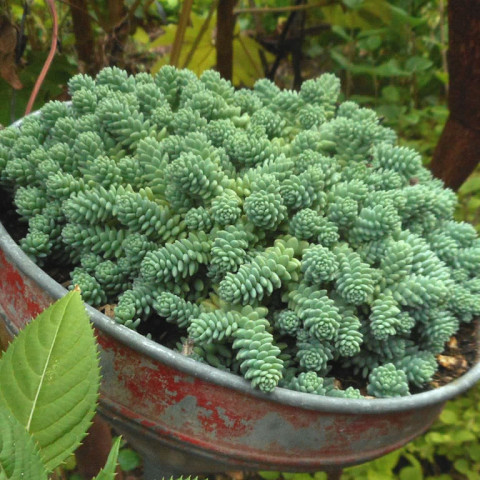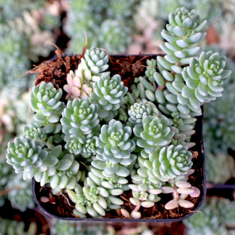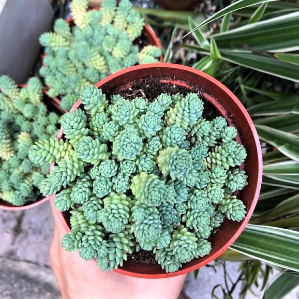 Sedum dasyphyllum ‘Himalayan Skies’, Crassulaceae familyasına ait, yavaş gelişen ancak zamanla yoğun ve düzgün bir örtü oluşturan bir Sedum dasyphyllum kültivarıdır. Bitki, çok kısa boğum aralarına sahip ince sürgünler üzerinde sıkı şekilde dizilmiş, minyatür, yuvarlak ve etli yapraklar taşır. Yapraklar genellikle soğuk mavi ile gri-yeşil tonlar arasında görülür ve yüzeylerindeki ince mumsu tabaka bitkiye mat, puslu bir görünüm kazandırır. Serin hava koşulları ve güçlü ışık altında bu renkler daha belirgin hale gelirken, sıcak ve gölgeli ortamlarda tonlar yeşile yaklaşabilir. Sedum dasyphyllum ‘Himalayan Skies’, yayılıcı karakteri sayesinde saksı içinde kubbemsi bir form alır ve zamanla yüzeyi tamamen kaplayan sık bir doku oluşturur.
