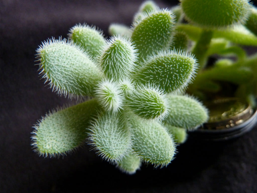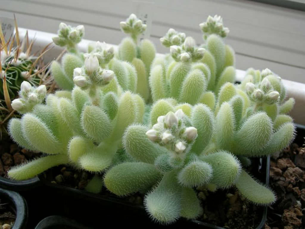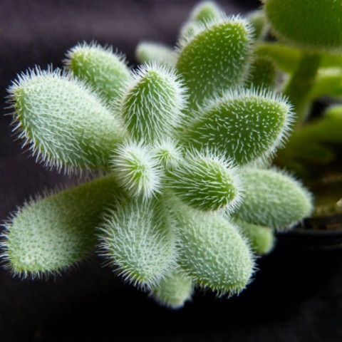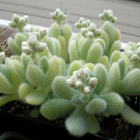 Sedum hintonii’nin yaprakları, bu türü diğer birçok sedumdan ayıran en belirgin morfolojik özelliğe sahiptir. Yapraklar etli ve dolgun yapılı olmakla birlikte yüzeyleri pürüzsüz değildir; tamamı kısa, ince ve yoğun tüylerle kaplıdır. Bu tüylenme yapraklara kadifemsi, yumuşak ve mat bir görünüm kazandırır. Yaprak formu genellikle oval ile eliptik arasında değişir ve gövde etrafında sık bir dizilim göstererek bitkiye kompakt bir yapı sağlar. Yaprak rengi açık yeşil tonlarındadır ve yoğun ışık altında sarımsı yeşile yaklaşabilir. Yaprak yüzeyindeki tüyler, ışığı dağıtarak yaprak dokusunun doğrudan güneş ışığına maruz kalmasını sınırlar ve bitkinin su kaybını azaltıcı bir etki oluşturur. Bu yapı, Sedum hintonii’nin doğal yaşam alanlarındaki kurak ve yüksek ışıklı koşullara uyum sağlamasında önemli rol oynar. Aşırı sulama veya yetersiz hava sirkülasyonu durumunda, tüylü yapraklar arasında nem birikimi oluşabilir ve bu durum yaprakların yumuşamasına veya gövdeden ayrılmasına yol açabilir. Bu nedenle yaprak dokusu, bitkinin bakım koşullarına karşı verdiği tepkilerin gözlemlenmesinde önemli bir göstergedir.