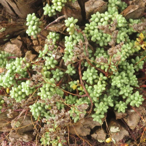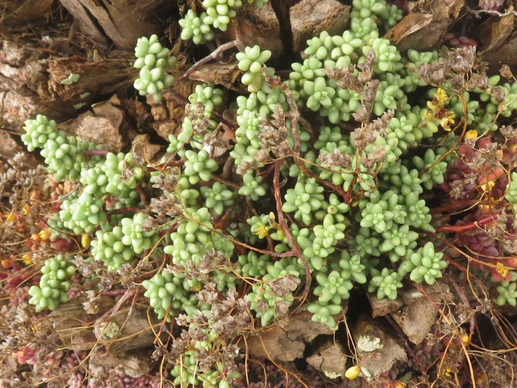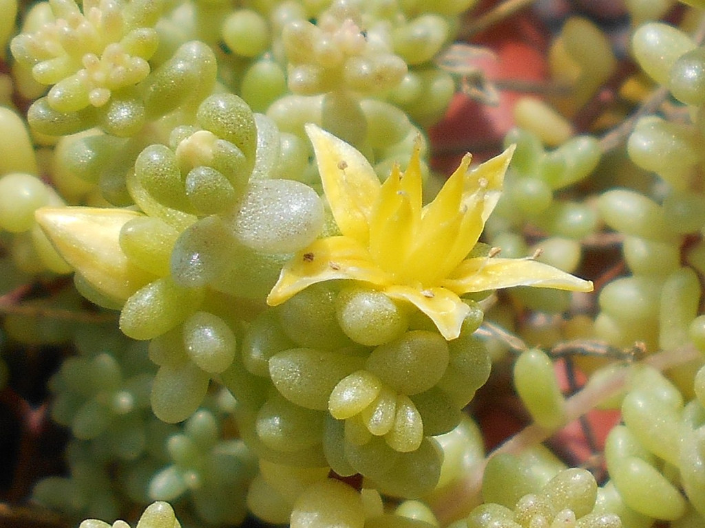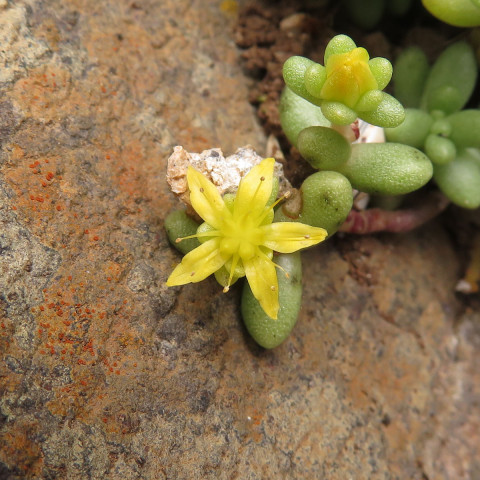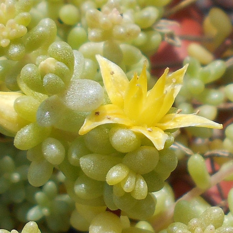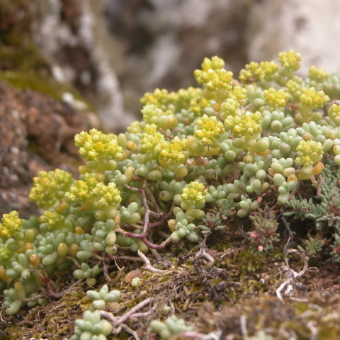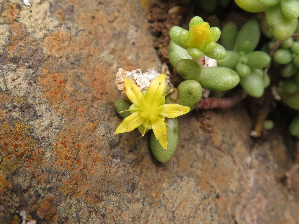Sedum lancerottense, Crassulaceae (damkoruğugiller) familyasına ait, yoğun sürgünlü yapısı ve küçük, etli yapraklarıyla tanınan bir sedum türüdür. Doğal yaşam alanlarında genellikle volkanik kökenli, taşlık ve hızlı drene olan zeminlerde gelişim gösterir. Kuraklığa uyum sağlamış sukulent yapısı sayesinde zorlu çevre koşullarına dayanıklıdır. Sık dallanır ve yayılarak büyür. Sedum lancerottense’nin yaprakları küçük, etli ve yuvarlak–oval formdadır. Yapraklar gövde üzerinde çok sık dizilim gösterir ve bitkiye dolgun, yoğun bir doku kazandırır. Yaprak yüzeyi pürüzsüzdür ve belirgin bir tüylenme bulunmaz. Yüzey dokusu hafif parlak olup ışığı yumuşak şekilde yansıtır. Yaprak rengi genellikle açık yeşil ile sarımsı yeşil tonları arasındadır. Yeterli ışık alan bitkilerde yapraklar daha sıkı ve dolgun bir görünüm kazanırken, yetersiz ışık koşullarında gövde uzaması ve yaprak aralarının açılması görülebilir.