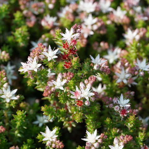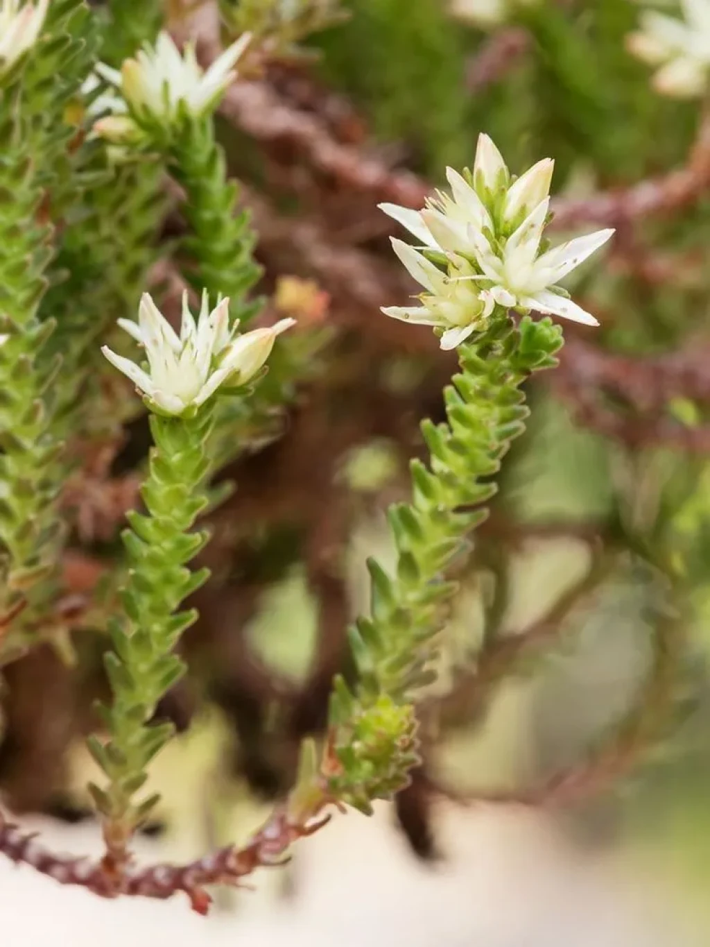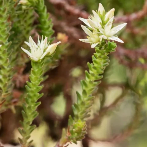 Sedum moranense, Crassulaceae familyasına ait, doğal yayılışı sınırlı olan ve özellikle kaya bahçeleri ile doğal görünümlü düzenlemelerde tercih edilen sedum türlerinden biridir. Doğada genellikle taşlık, volkanik ya da mineral açısından fakir topraklarda gelişim gösterir. Bu habitat koşulları, bitkinin suyu verimli kullanabilen ve zorlayıcı çevre şartlarına uyum sağlamış bir yapıya sahip olmasına neden olmuştur. Sedum moranense, sık dallanan ve yere yakın gelişen yapısıyla kümeler oluşturur. Sedum moranense’in yaprakları küçük, etli ve sık dizilimlidir. Yapraklar gövde etrafında yoğun bir şekilde yer alır ve bitkiye dolgun bir görünüm kazandırır. Yaprak rengi çoğunlukla yeşil tonlarında olmakla birlikte, güneş ışığına maruz kalma süresine bağlı olarak kızılımsı veya bronzumsu tonlar gösterebilir. Bu renk değişimi bitkinin sağlıklı bir ışık aldığının göstergesi olarak kabul edilir. Yaprak yüzeyi pürüzsüzdür ve su depolama özelliği belirgindir. Bu özellik, Sedum moranense’in düzensiz sulama koşullarına karşı dayanıklı olmasını sağlar.