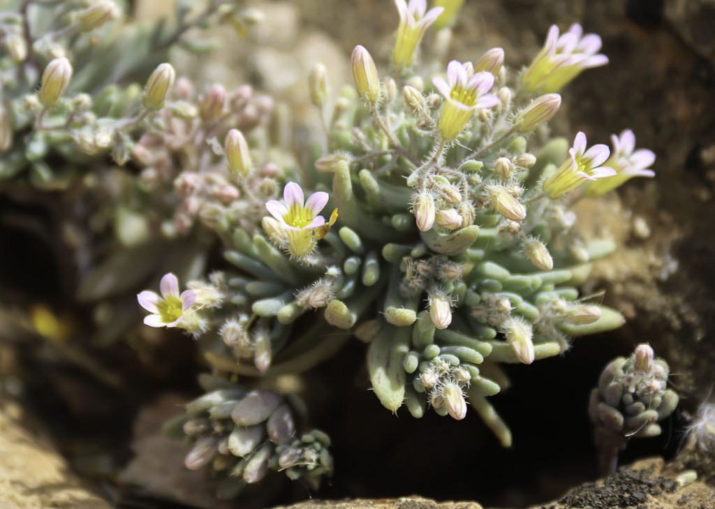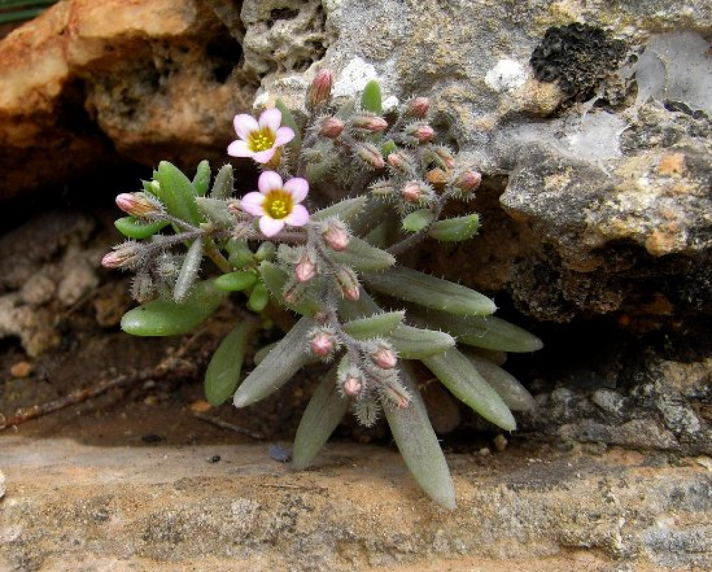 Sedum mucizonia, Crassulaceae familyasına ait, doğal yayılış alanları sınırlı olan ve özellikle kayalık, taşlık arazilerde gelişim gösteren özgün bir sedum türüdür. Doğada genellikle mineral bakımından fakir, geçirgen ve hızlı kuruyan zeminlerde bulunur. Bu çevresel koşullar, bitkinin sukulent karakterinin belirginleşmesine ve suyu yapraklarında depolayarak hayatta kalmasına olanak tanır. Sedum mucizonia’nın yaprakları dar, etli ve uzamış formdadır. Yapraklar gövde etrafında düzenli bir dizilim gösterir ve uçlara doğru hafif sivrilen bir yapı sergiler. Yaprak yüzeyinde ince tüylenmeler bulunabilir; bu yapı bitkinin aşırı güneş ışığına ve buharlaşmaya karşı korunmasına yardımcı olur. Yaprak rengi genellikle yeşil tonlarında olmakla birlikte, ışık yoğunluğu arttıkça grimsi, pembemsi veya hafif kızılımsı tonlar görülebilir. Bu renklenme bitkinin sağlıklı bir ışık aldığının göstergesi olarak değerlendirilir. Yapraklar su depolama görevini üstlendiğinden, bitki kısa süreli susuzluklara karşı dayanıklıdır.