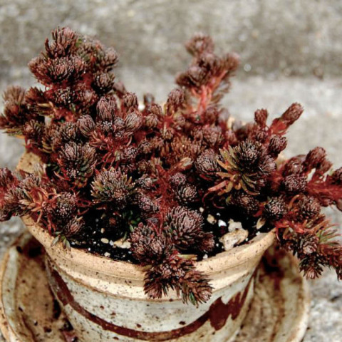 Bu kültivar için toprak seçimi büyük önem taşır. Sedum polytrichoides ‘Chocolate Ball’ için kaktüs ve sukulentler için hazırlanmış geçirgen bir toprak karışımı kullanılmalıdır. Sulama, toprak tamamen kuruduktan sonra yapılmalıdır. Sulama sırasında suyun saksının tamamına nüfuz etmesi sağlanmalıdır. Sürekli nemli kalan toprak, ince gövdelerde yumuşamaya, kararmaya ve kök çürümesine neden olabilir. Sulama esnasında yapraklara su değmemesine özen gösterilmelidir; özellikle sıcak dönemlerde yaprak üzerinde kalan su damlaları yanıklara yol açabilir. Saksı seçiminde drenaj delikleri bulunan saksılar tercih edilmelidir. Toprak saksılar, buharlaşmayı artırarak toprağın daha hızlı ve dengeli kurumasına katkı sağlar; ancak plastik saksılar da doğru sulama düzeni sağlandığında kullanılabilir. Sedum polytrichoides ‘Chocolate Ball’un kök sistemi yüzeyseldir ve derin saksılara ihtiyaç duymaz. Geniş ağızlı ve alçak saksılar, bitkinin yayılıcı gelişimini destekler. Saksı ve toprak değişimi bitki ilk alındığında yapılabilir; ilerleyen dönemlerde ise ilkbahar ayları tercih edilmelidir.