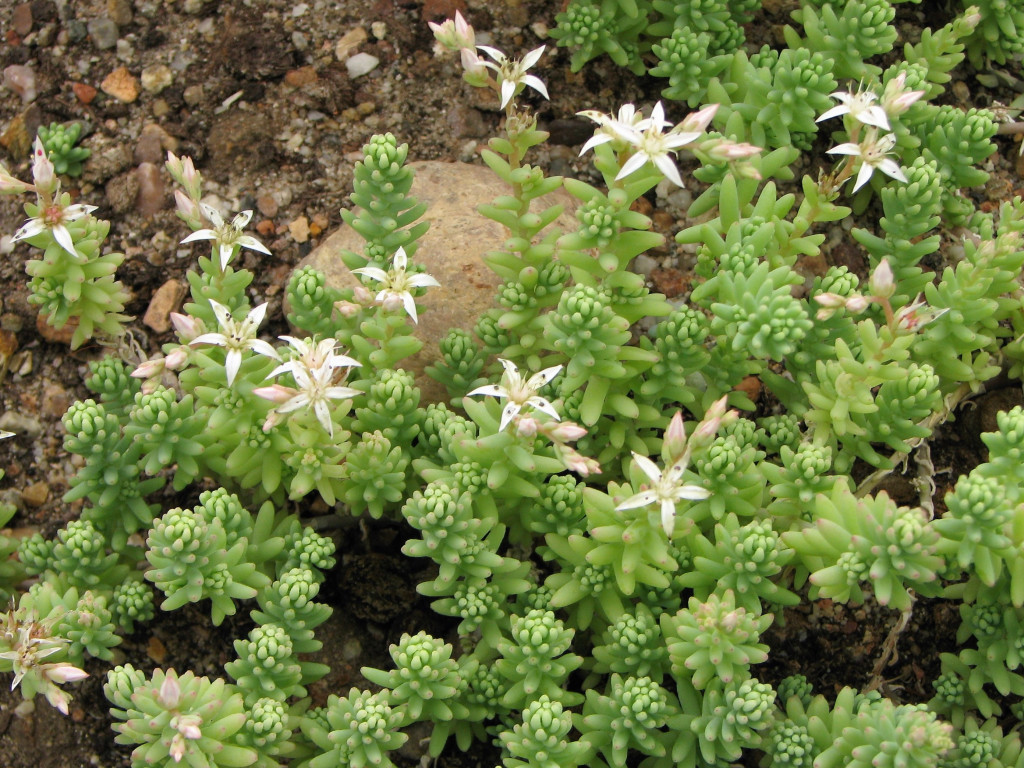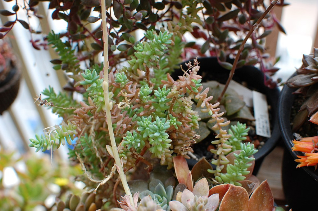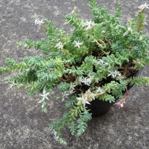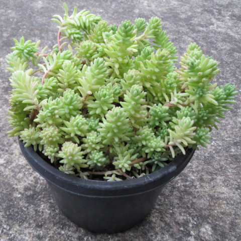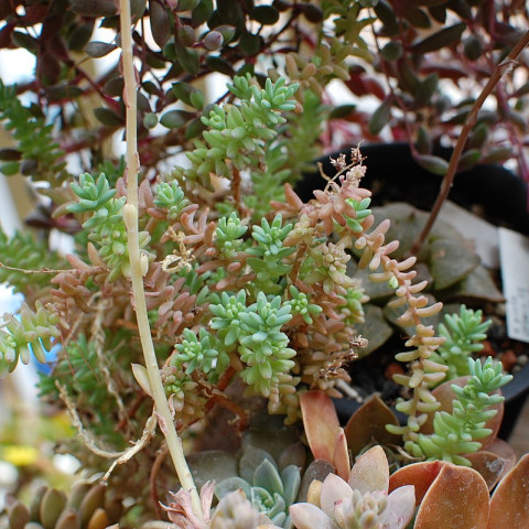 Sedum potosinum, Crassulaceae familyasına ait, sarkıcı ve yayılan gelişim gösteren bir sedum türüdür. Doğal yayılış alanı Meksika’nın kurak ve yarı kurak bölgeleridir. Bu tür, ince ve etli gövdeleri boyunca yoğun şekilde dizilmiş küçük, silindirik–oval yapraklarıyla tanınır. Yapraklar genellikle açık yeşil renkte olup, yeterli güneş ışığı aldığında uç kısımlarda pembe veya kızılımsı tonlar geliştirebilir. Gövdeler zamanla uzar ve yerle temas eden kısımlarından kolayca köklenerek bitkinin yayılmasını sağlar. Bu özellik, Sedum potosinum’u sarkıcı saksılar, kaya bahçeleri ve yer örtücü düzenlemeler için uygun hale getirir.