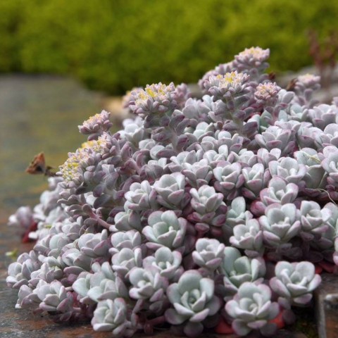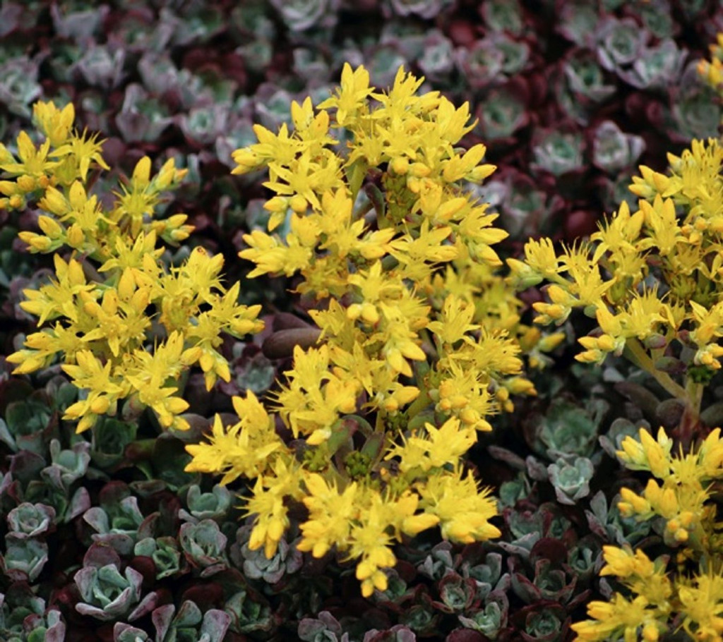 Sedum spathulifolium ‘Purpureum’, düşük boylu, yayılıcı gelişim gösteren ve yoğun rozetler oluşturarak yüzeyi kaplayan, yaprak rengiyle öne çıkan bir Sedum spathulifolium varyetesidir. Yapraklar spatula formunda, kalın ve etlidir; yüzeylerinde belirgin bir mumsu tabaka bulunur ve bu yapı bitkiye mat bir görünüm kazandırırken aynı zamanda su kaybını azaltır. Güneş ışığının şiddetine ve mevsimsel serinliğe bağlı olarak yaprak rengi gümüşi maviden morumsu ve bordoya çalan tonlara dönüşebilir. Gövdeler yatay yönde gelişir ve toprağa temas eden kısımlardan kolayca köklenerek zamanla sık ve homojen koloniler meydana getirir. İlkbahar sonu ile yaz başında rozetlerin arasından yükselen kısa çiçek sapları üzerinde parlak sarı, yıldız biçimli çiçekler açar.