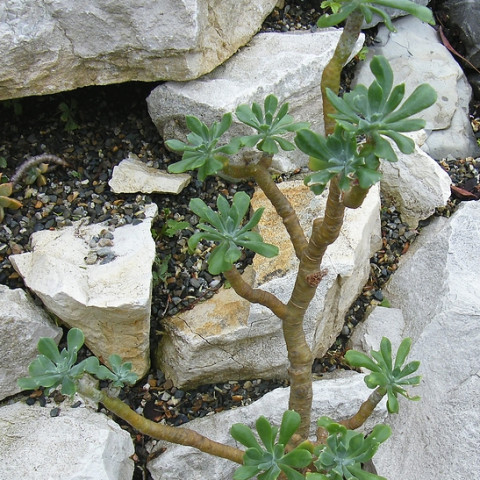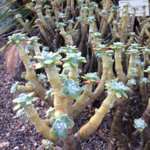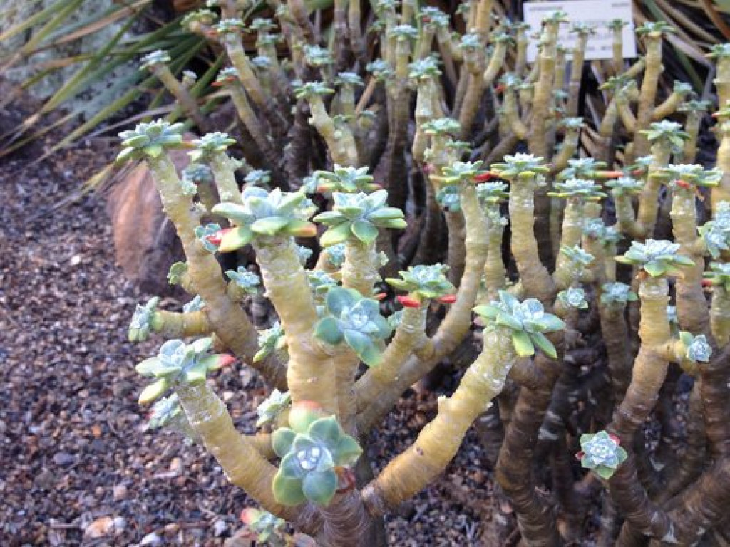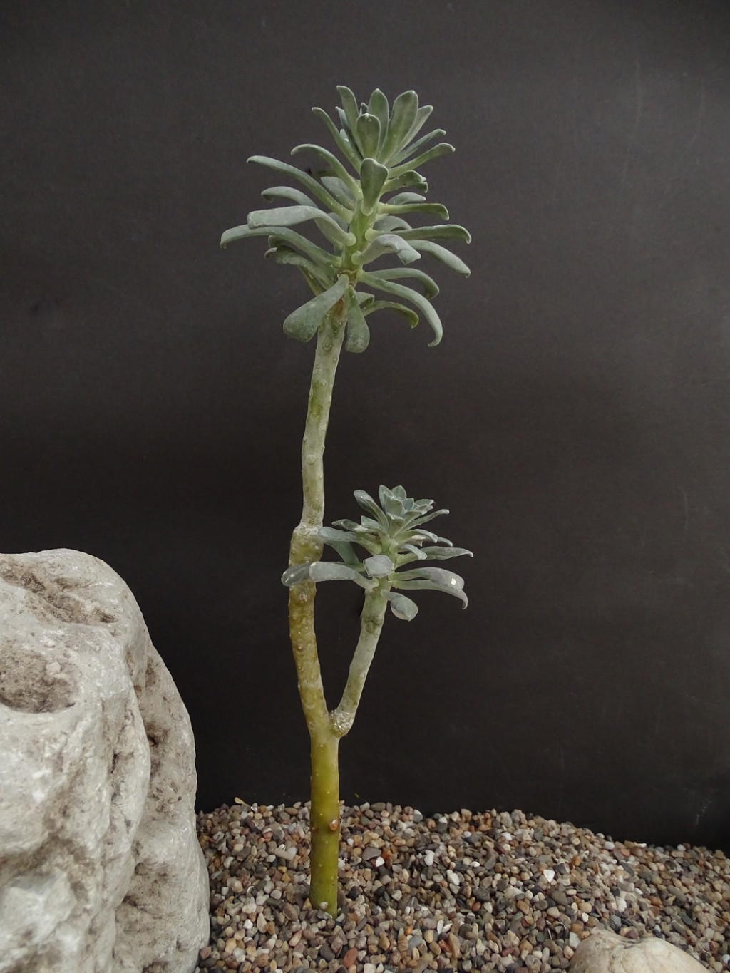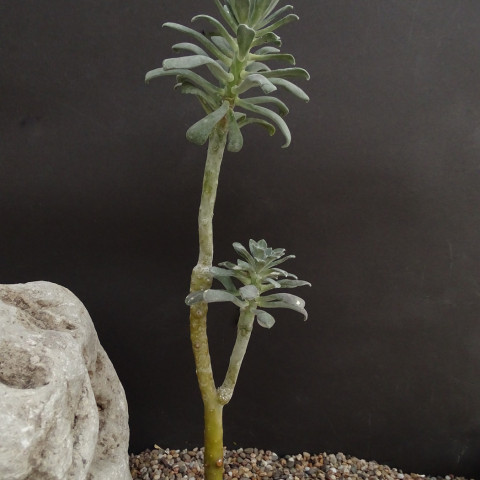 Sedum torulosum, Crassulaceae familyasına ait, odunsu görünümlü gövdeleri ve rozet formunda yaprakları ile ayırt edilen özgün bir sedum türüdür. Doğal yayılış alanlarında genellikle kurak iklim koşullarına sahip, taşlı ve geçirgen zeminler bulunur. Gövdeler dik veya hafif eğimli şekilde gelişir. Zamanla kalınlaşarak yarı odunsu bir yapı kazanır. Bu yapı, bitkinin su kaybını sınırlamasına ve çevresel streslere karşı direnç geliştirmesine katkı sağlar. Sedum torulosum yaprakları gövde uçlarında rozetler halinde toplanır. Yapraklar etli, kısa ve geniş formdadır. Uç kısımları yuvarlak yapıdadır. Yaprak yüzeyi pürüzsüzdür ve hafif mumsu bir tabaka ile kaplıdır. Renkleri çoğunlukla maviye çalan yeşil tonlarındadır. Yüksek ışık koşullarında yaprak kenarlarında pembe veya kırmızımsı renklenmeler görülebilir. Yaprak dokusu su depolamaya uygundur ve bitkinin kurak dönemlerde canlılığını korumasını sağlar.