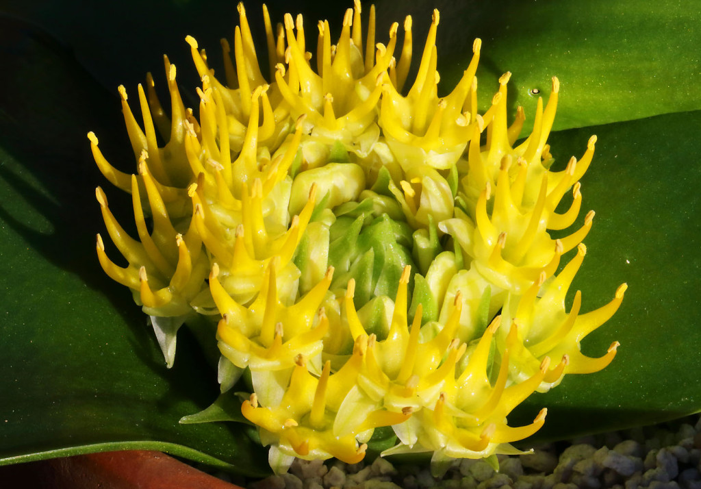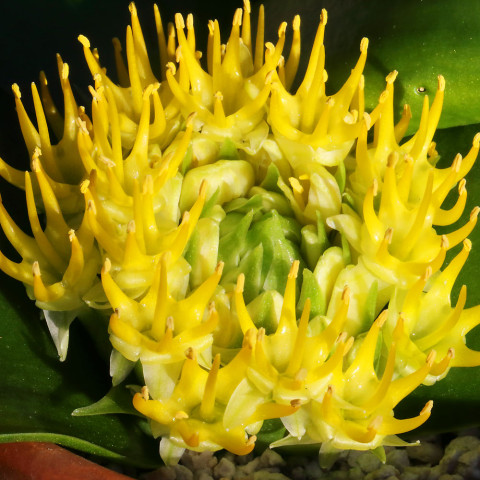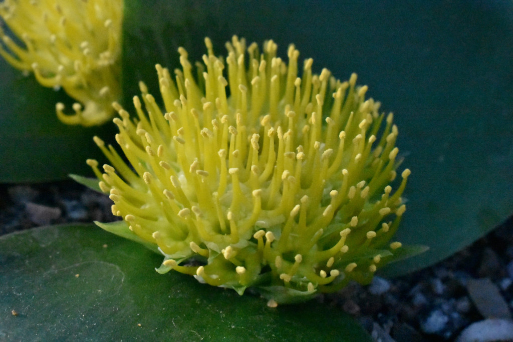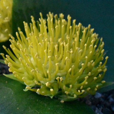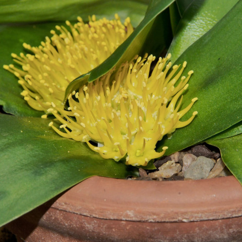Massonia citrina, Güney Afrika kökenli, kış aylarında aktif büyüme gösteren ve yaz döneminde dinlenme sürecine giren soğanlı bir sukulent türüdür. Bu tür, yere tamamen yatık gelişen iki adet kalın ve geniş yaprağı ile karakterizedir. Yaprak yüzeyi genellikle düz, hafif parlak ve açık yeşil tonlardadır; bazı örneklerde yüzeyde hafif beneklenmeler veya dokusal farklılıklar gözlemlenebilir. Yapraklar toprağa paralel şekilde yayılarak gelişir ve bu form, bitkinin doğal habitatında nem ve ışık dengesini optimize etmesini sağlar. Bitkinin merkezinde oluşan çiçek yapısı ise oldukça kompakt, yoğun ve toprağa yakın konumlanır. Massonia citrina çiçekleri genellikle açık sarı tonlarında olup, tür adını da buradan alır. Çiçekler sıkı bir küme halinde gelişir ve uygun koşullar sağlandığında hafif bir koku yayabilir.