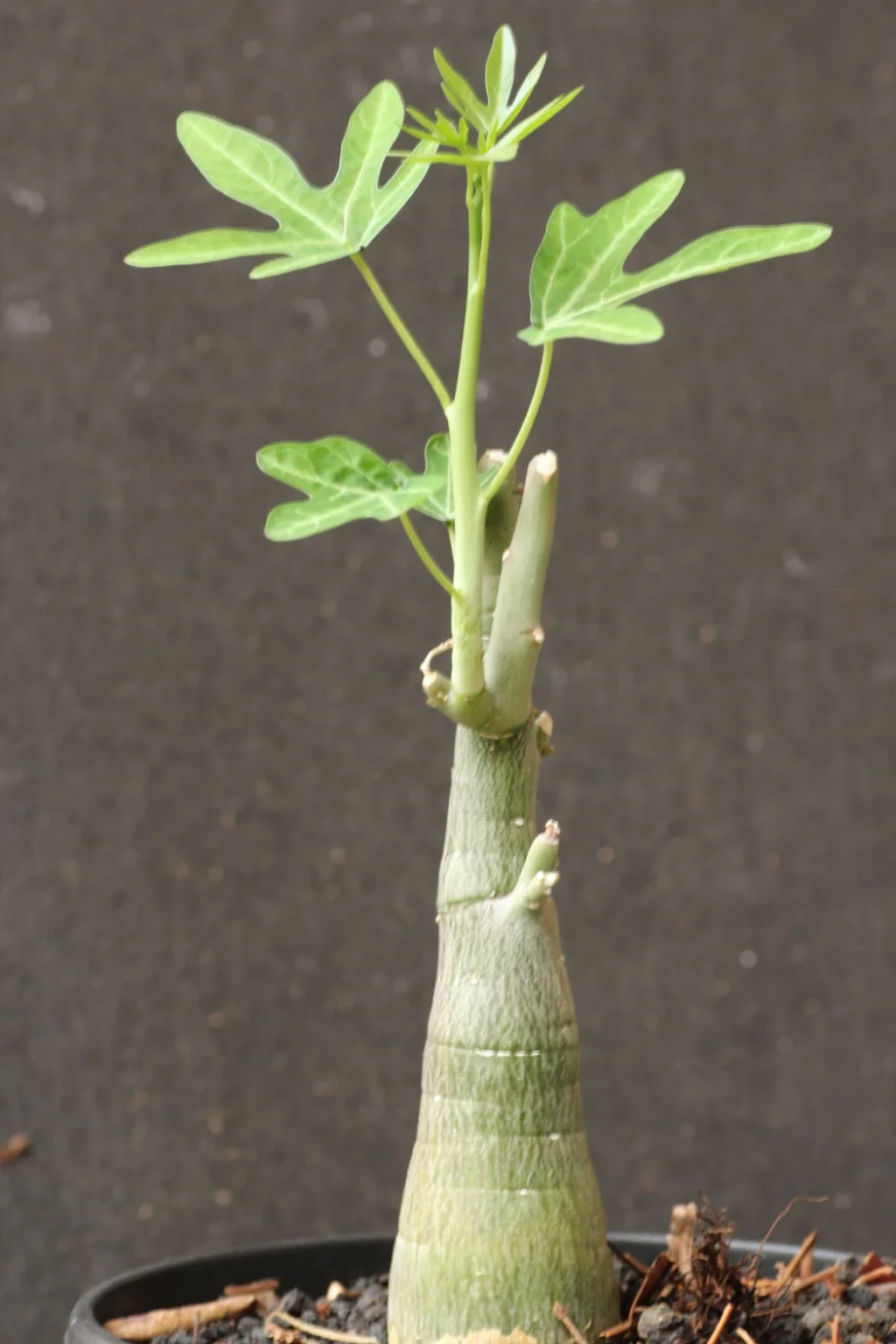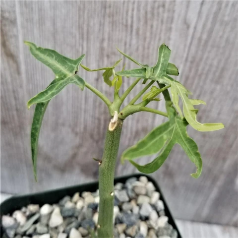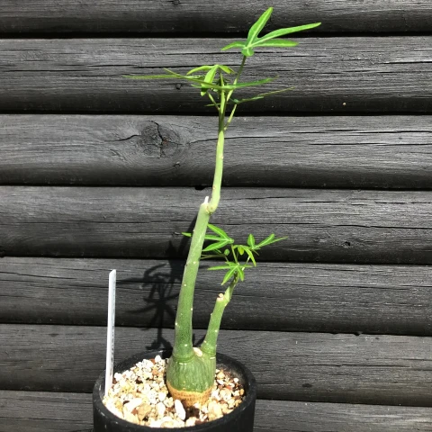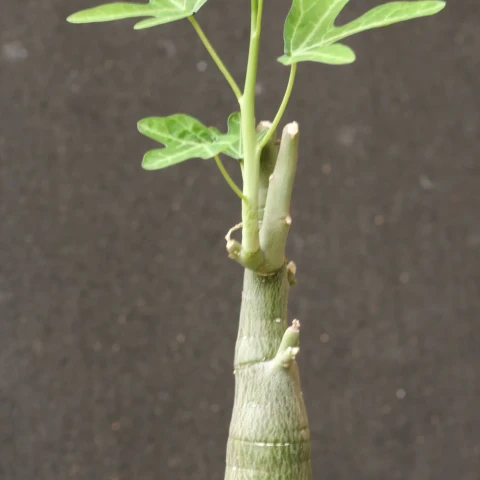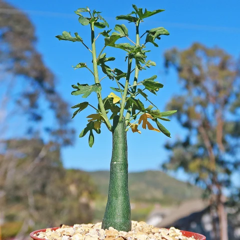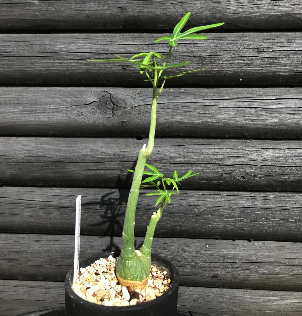 Adenia venenata’nın gövdesi genellikle toprak yüzeyinin üzerinde yükselir ve tabandan yukarı doğru daralan bir görünüm sergiler. Yüzeyi pürüzsüzdür ve yeşilin farklı tonlarında görülür. Bu yapı bitkinin su ve besin depolamasını sağlar. Kaudeksten çıkan sürgünler dik ve yarı odunsu yapıdadır. Sürgünler büyüme döneminde yukarı doğru gelişir ve zamanla dallanma gösterebilir. Gövdeler genellikle dik formda kalır, belirgin bir sarılıcı özellik göstermez. Yaprak dokusu ince, yüzeyi mattır. Aktif büyüme döneminde yapraklar canlı yeşil renkte gelişir. Kuraklık veya serinlik arttığında yaprak dökümü yaygın olarak gözlenir. Adenia venenata’nın çiçekleri küçük, sade ve bitkinin genel görünümüne kıyasla ön planda olmayan yapıdadır. Çiçekler yeşilimsi ya da sarımsı tonlarda görülür.